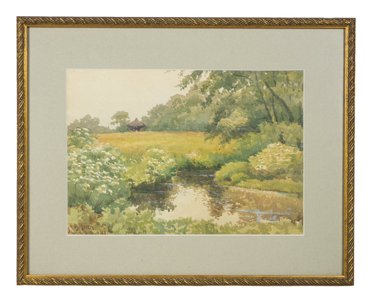 Both signed l.r. “F.B. Allen 1921″ (Frederick B. Allen), both framed and matted, one showing a stone wall with rocky outcroppings, and dry river bed with pine trees, 11 1/2″ x 17 1/2″, the other a summer landscape with river and banks of white flowers, house in the background, 9 1/2″ x 13 1/2”.