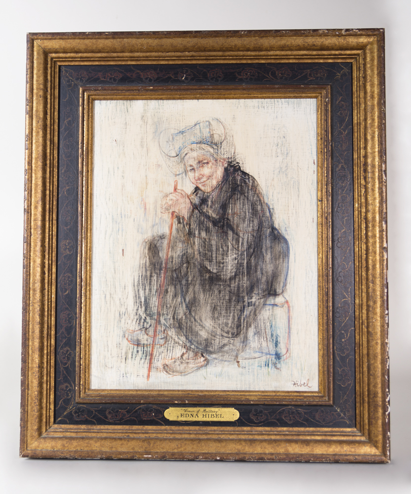 On wood panel, “Woman of Brittany”, signed l.r. “Hibel” (Edna Hibel, American, 1917-2015), carved, painted and molded wood frame, gallery label on back “Frank J. Oehlschlaeger Gallery, Sarasota & Chicago.”, 18″ x 15″, (ex. Dr. Oscar and Lois Hollander collection, Falmouth, MA).