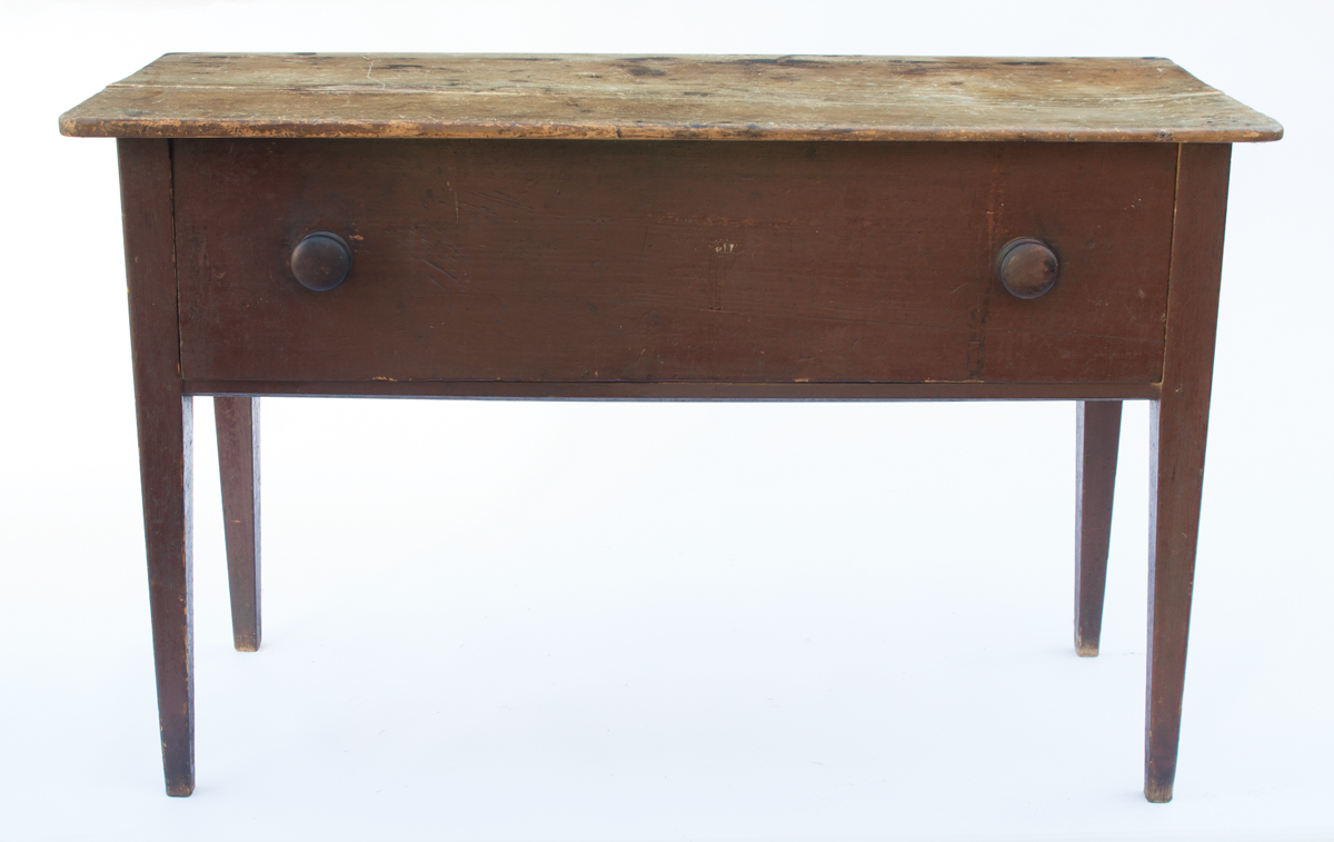 Pine, original dark red painted finish, old split, single full-length dovetailed drawer with walnut pulls, square tapered legs, c. 1840, 30″ h, 48″ w, 18 1/2″ d, (ex. Marjorie Ellis estate, Sandwich, MA).