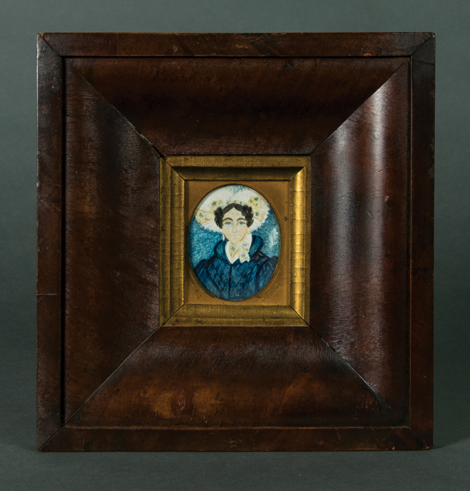 Oval watercolor portrait of a young lady with brown hair and blue eyes, white ribbon and hat in blue floral pattern, inner frame marked “Clark & Holmes Troy, NY – Pat. July 4 & 11, 1854″, 2 3/4″ x 2 1/2″ (sight), 9 3/4″ x 9 1/4” (frame), (ex. Fertig collection).