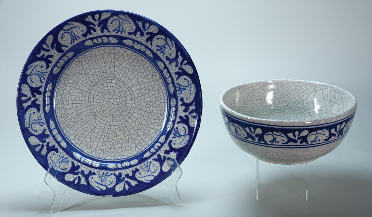 Large salad bowl with two-ear rabbit, very fine condition, 3 1/2″ h, 8 3/4″ dia; Large charger with two-ear rabbit, two incised bunny tails on bottom, very fine condition, 12 1/4″ dia; (ex. Dr. Oscar and Lois Hollander collection, Falmouth, MA).