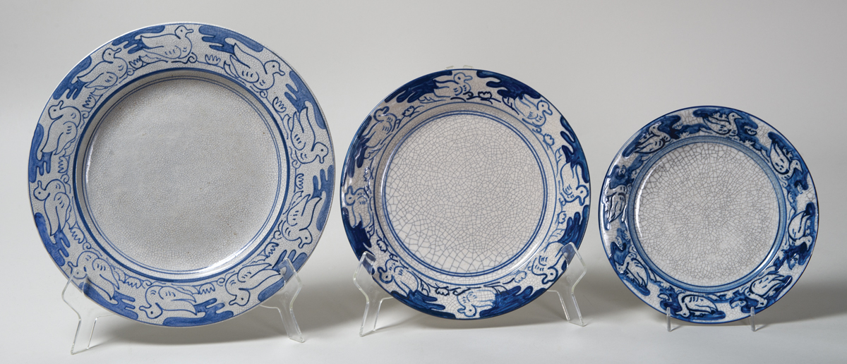 Rare duck pattern charger, ten swimming ducks with water lilies, very clean blue rabbit decal on bottom, very good condition, 12″ dia; Plate with eight ducks, two impressed rabbit tails and a faint blue decal on bottom, some chipping on foot, and a 1 1/2″ hairline at rim shows on back, slightly raised surface, 10″ dia; Plate with raised (tufted) duck, medium dark blue, impressed rabbit tail on back, overall good condition, 8 1/2″ dia; (ex. Dr. Oscar and Lois Hollander collection, Falmouth, MA).