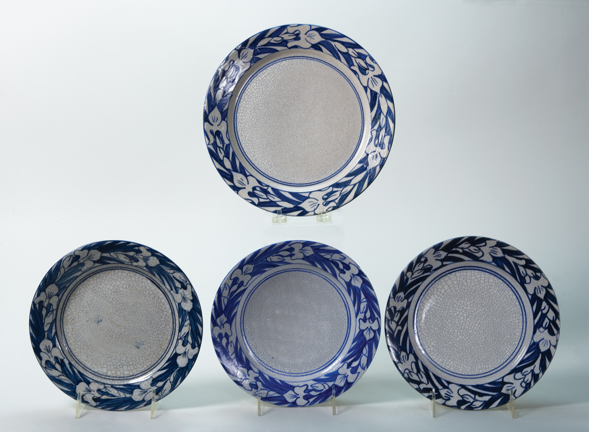 Three Iris pattern plates (8 1/2″ dia): very dark cobalt, with impressed bunny tail and rectangular blue decal on bottom, overall good condition; second plate with lighter blue decoration, small rim chip, blue decal; third plate with small circle signature in one iris, impressed bunny tail and decal on bottom, tiny rim chip, otherwise good condition; and a plate with seven iris on blue leaf background, very tight crackle, two impressed bunny tails and a blue decal on bottom, overall good condition, 9 3/4″ dia; (ex. Dr. Oscar and Lois Hollander collection, Falmouth, MA).