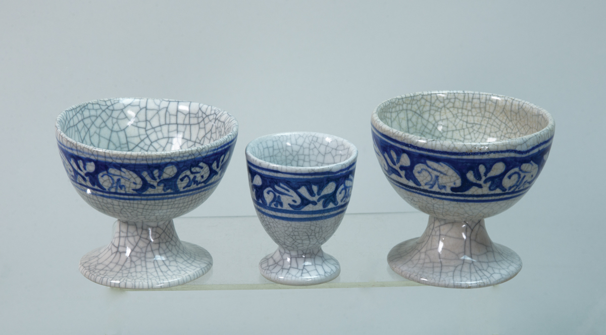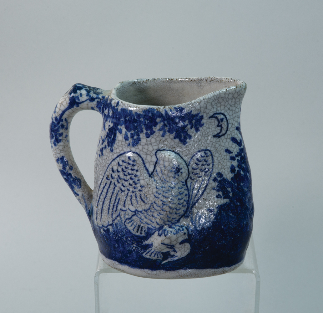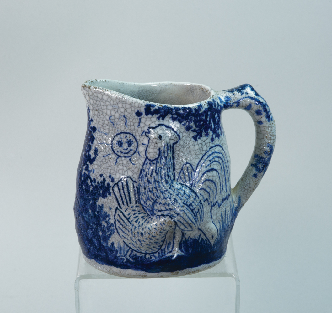 Morning/night pitcher, raised rooster and smiling sun on one side, and raised owl and moon on opposite, good condition, 5″ h; Magnolia plate, good condition, 6″ dia; Egg cup, rabbit, 2 1/4″ h; Two double egg cups, rabbit, 3″ h; (ex. Dr. Oscar and Lois Hollander collection, Falmouth, MA).