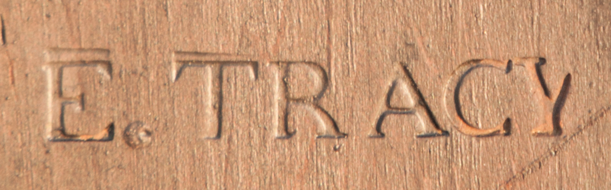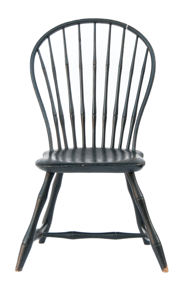 Connecticut bowback Windsor side chair, in an older black painted finish, nine bamboo turned spindles, saddle seat, splayed legs with “H” stretcher, stamped on bottom “E. Tracy”, from a Wellesley, MA estate, 16″ seat h, 36″ overall h.