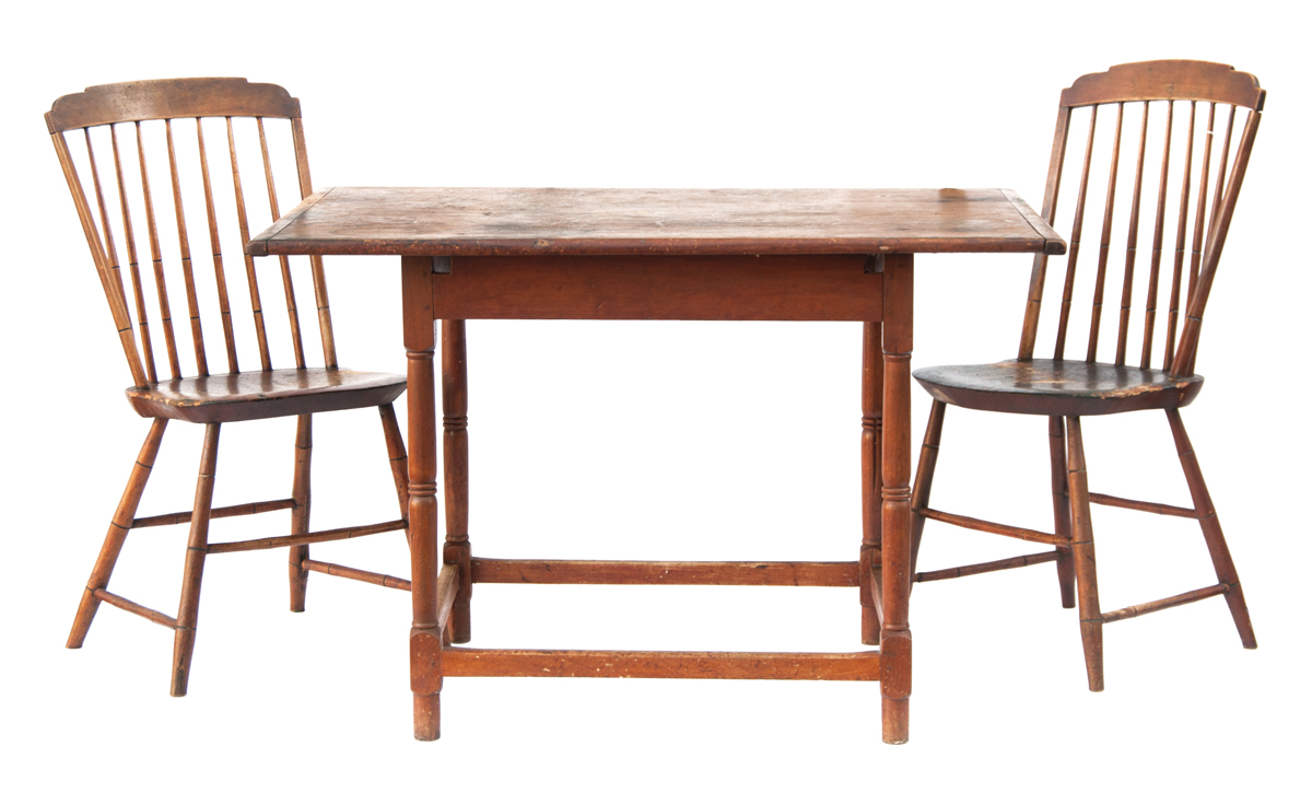 New England country, pine and birch, stretcher base tavern table, breadboard top, turned legs with box stretcher, traces of old red, 28″ h, 43″ w, 28 1/4″ d; Two early 19th c. stepdown Windsor side chairs, pine and maple, traces of old red finish, 17 1/2″ seat h, 35 1/2″ overall h; from a Wellesley, MA estate.