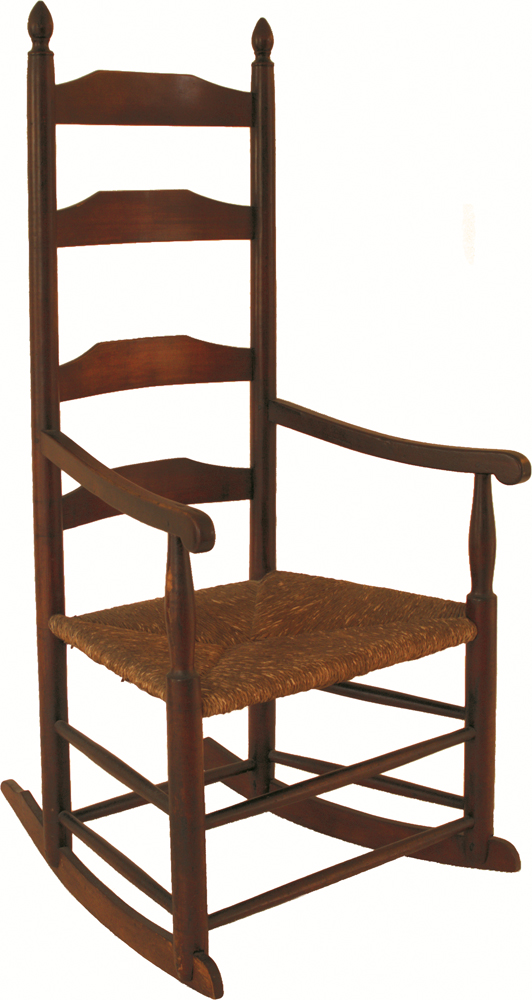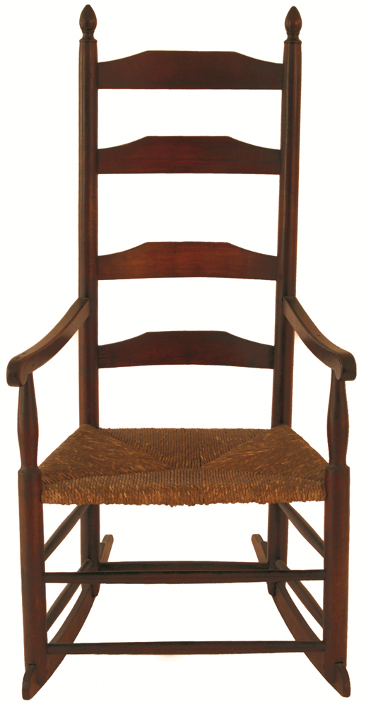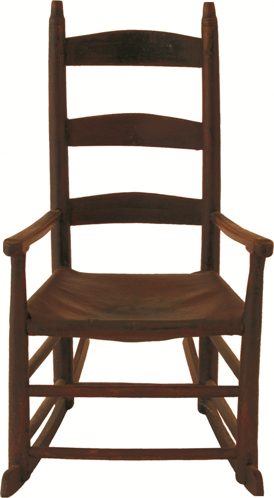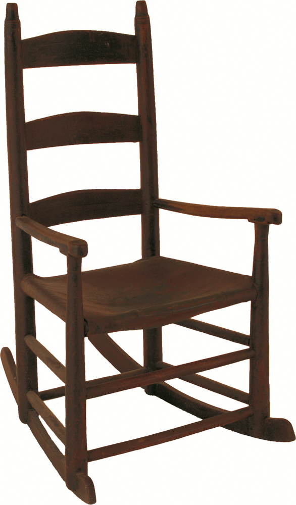 Child’s three-slat with carved arms, old leather seat, original red finish, 12 1/2″ seat h, 32 1/2″ overall h; and an adult rocker with four shaped slats, acorn finials, early rush seat, maple, old finish, 16″ seat h, 48″ overall h; (ex. Dr. Oscar and Lois Hollander collection, Falmouth, MA).