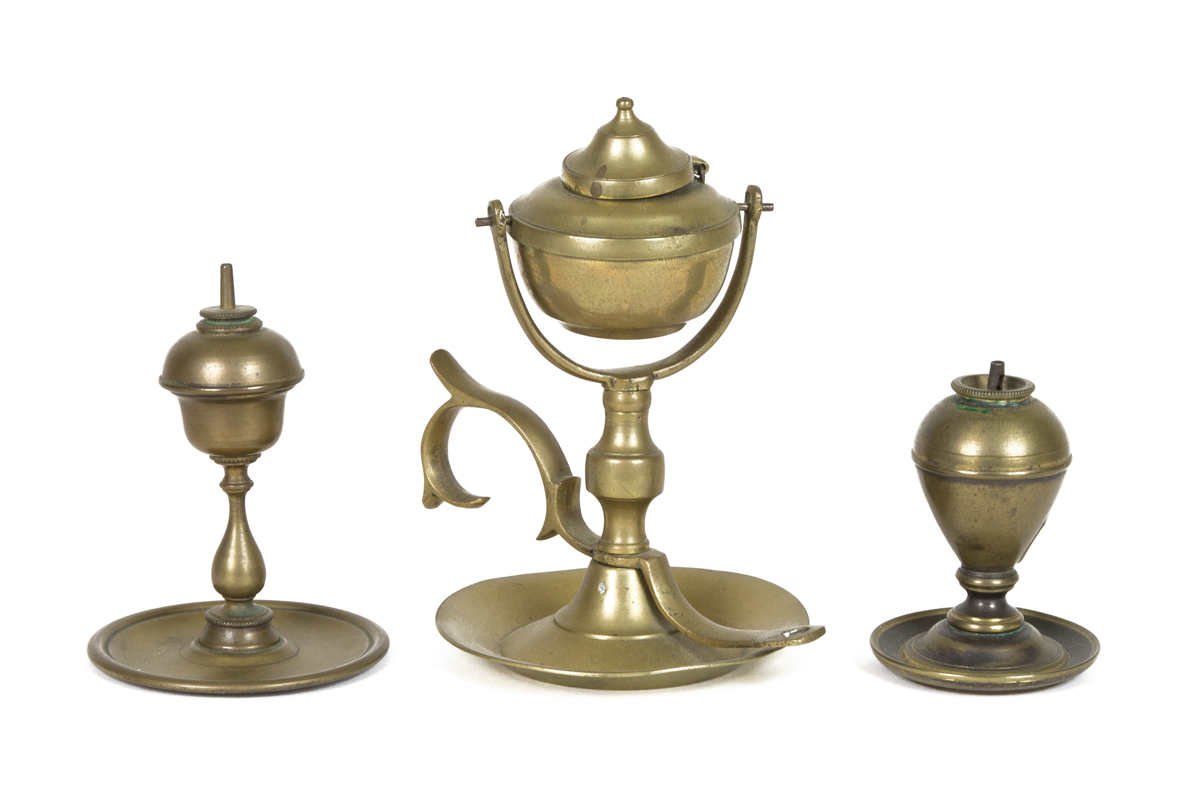 Rare 19th c. finely turned brass, single wick, saucer based whale oil lamp, 4 1/4″ h; Rare brass ship’s, saucer based, whale oil lamp, with handle and wick cap, very finely made, 6″ h; Small saucer based, pear shaped, whale oil lamp, 3 1/4″ h; (ex. Dr. Oscar and Lois Hollander collection, Falmouth, MA).
