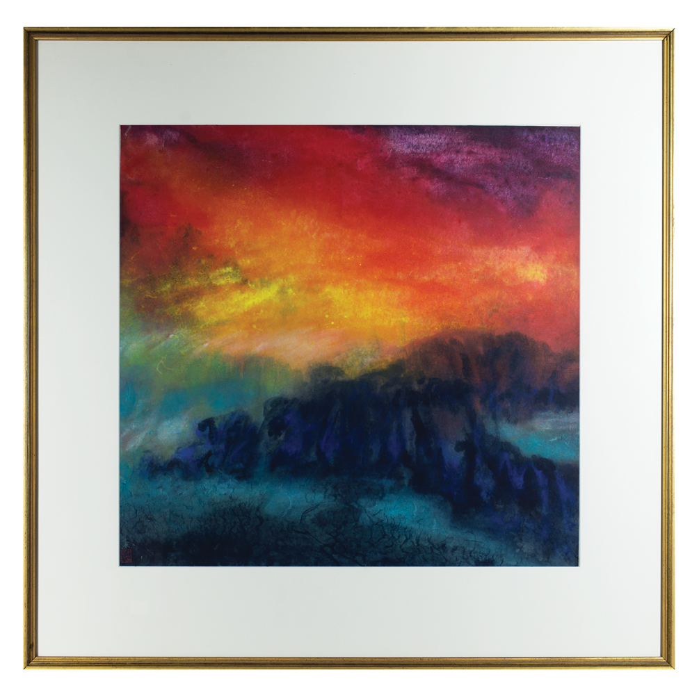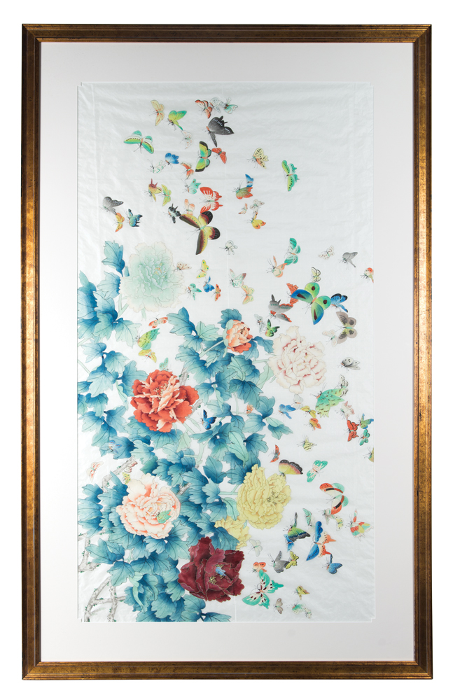 Two large pictures, framed and matted, one with butterflies and flowers, 22″ x 39 1/2″ (sight), the other impressionistic sunrise, blue and red, 25″ x 26″, (ex. Connors estate, Duxbury, MA).