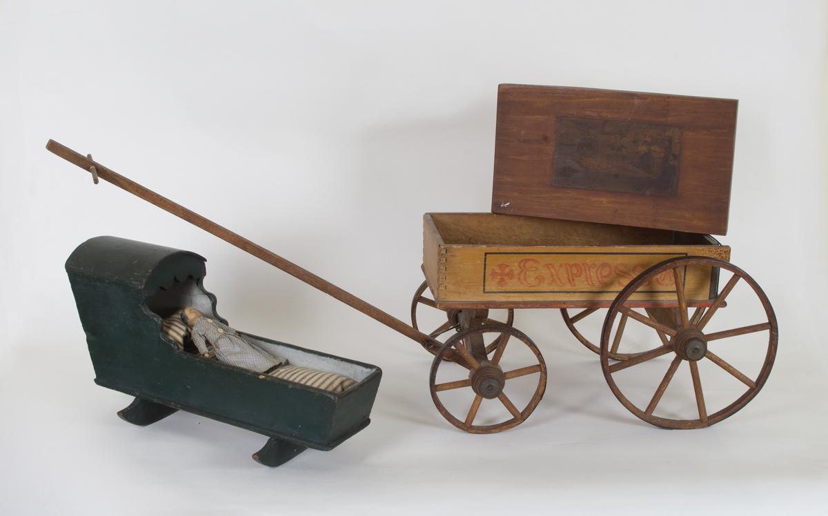 Pine wagon with wood and iron wheels, the “Express”, “made by Paris Mfg. Co., South Paris, Me. No 24″, 19″ l; Doll’s hooded cradle, in early green paint, 18″ l, with wood doll; Boxed tabletop croquet set for eight players, complete set, 13” box; (ex. Dr. Oscar and Lois Hollander collection, Falmouth, MA).