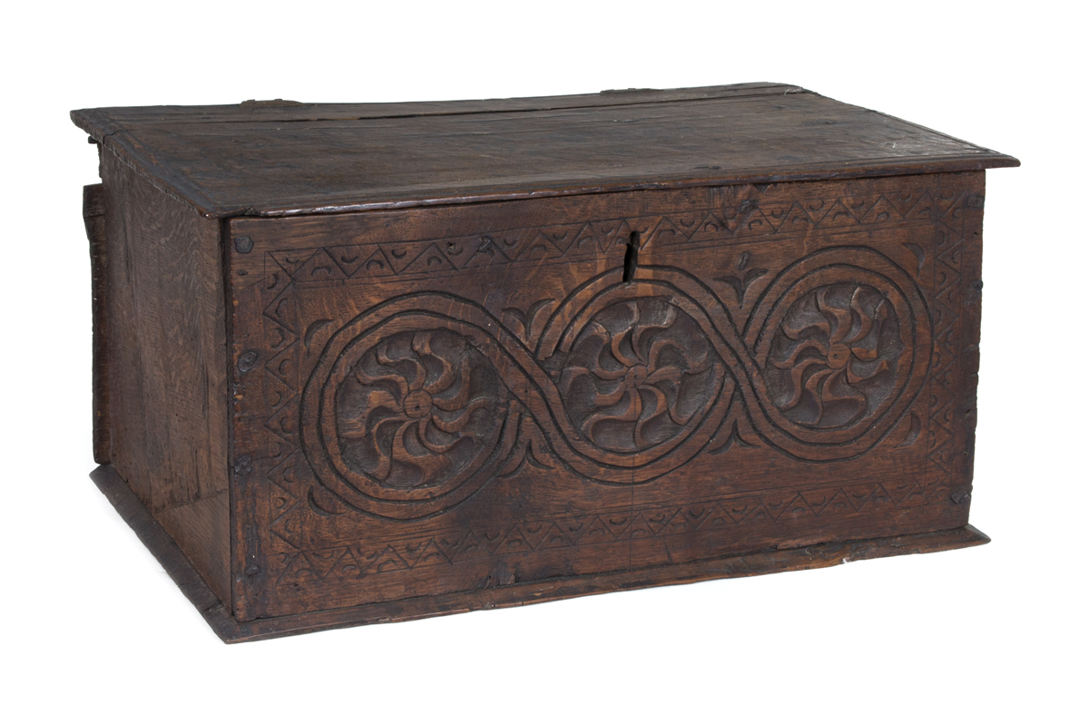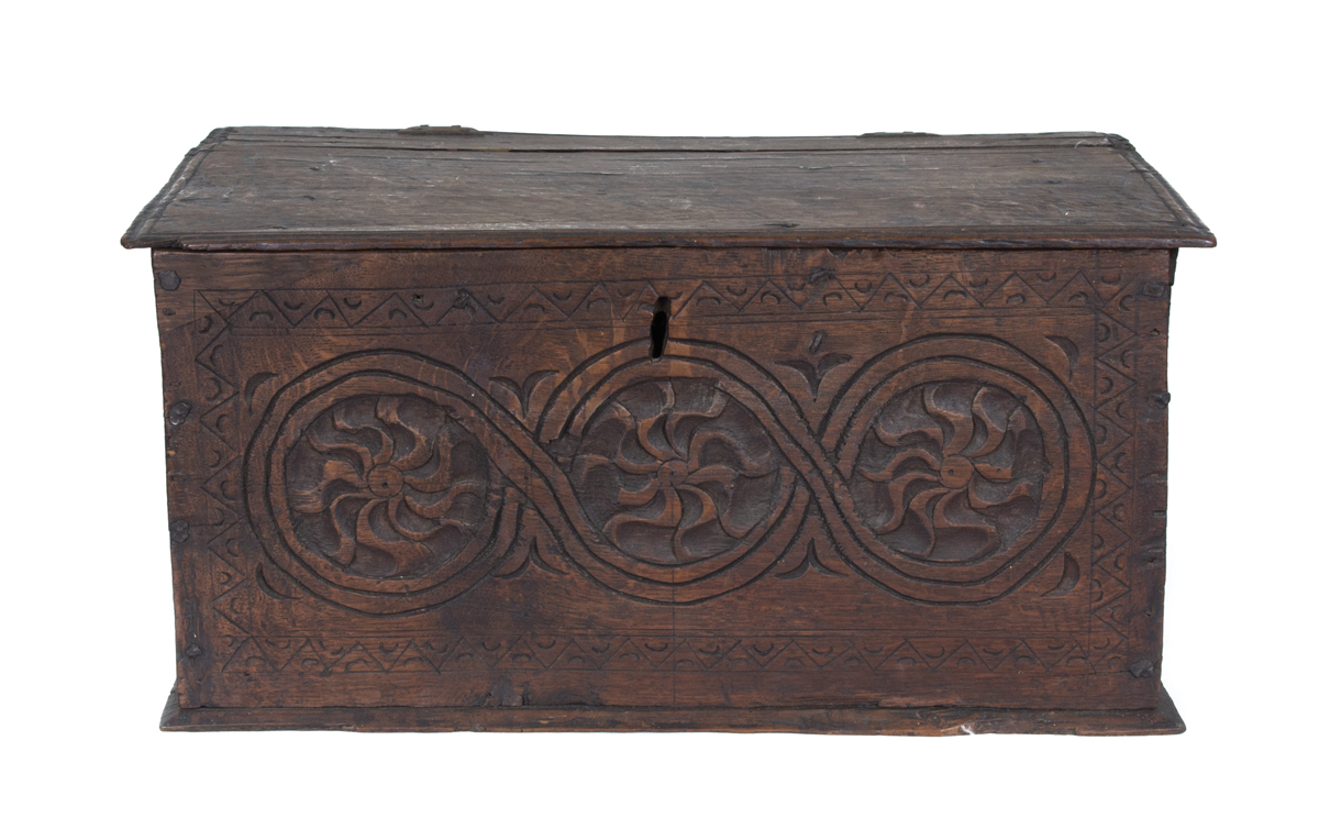 English, finely carved front, three circular interwoven pinwheels, with half moon border in triangles, original molded top, old split, forged brass butterfly hinges, 9″ h, 19″ w, 12″ d, (ex. Dr. Oscar and Lois Hollander collection, Falmouth, MA).