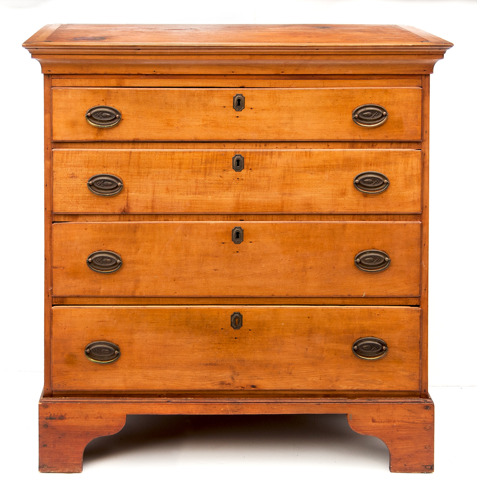 Maple and tiger maple, step molded top, dovetailed and molded drawers, with oval brasses with acorns, separate old carved base replaced, 40″ h, 35″ (dovetailed case), 20″ d, (ex. Channing Howe estate, Duxbury, MA).