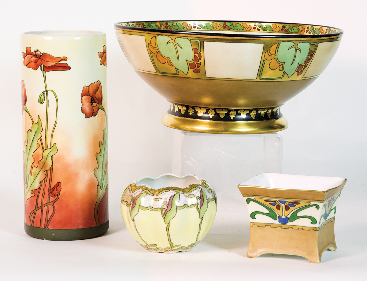 19th/early 20th c. French Limoges porcelain, decorated in New England: Vase with orange poppies, signed “Amy E. Breckenridge, July 1913″, 12 1/2” h; Footed punch bowl, geometric leaf and berries, band of black and gold grape and leaf design at base, flared gilded foot, signed “John E. Breckenridge, May 4, 1916, from Amy”; Two smaller pieces, one with rim chip, both signed, “Austria” and “Breckenridge”, (ex. Anna C. Roeder estate, Quincy, MA).