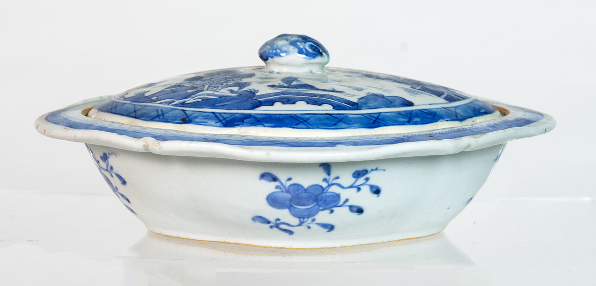 Canton, blue and white, ceramic covered bowl, small nick at lid, 4 1/2″ h, 10 1/2″ l, 9″ w, (ex. Channing Howe estate, Duxbury, MA).