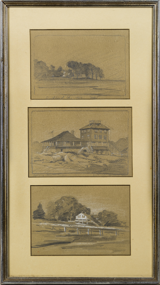 Oceanside homes by Max Russell Woodson (American, 1895-1953), in pencil and chalk, signed in pencil at bottom of drawings, 22 1/2″ x 12 1/2″ (frame).
