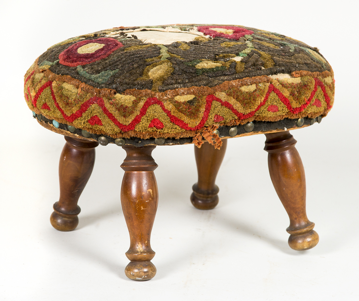Rag rug top depicting a basket of red flowers, the sides have a red swag design, turned legs, (some top rug is missing), 9 1/2″ h, 14″ x 11″ (top), (ex. Dr. Oscar and Lois Hollander collection, Falmouth, MA).