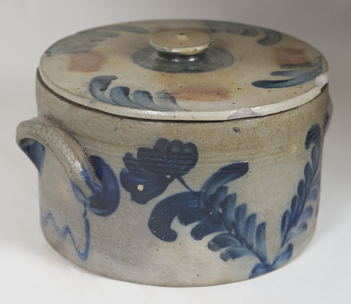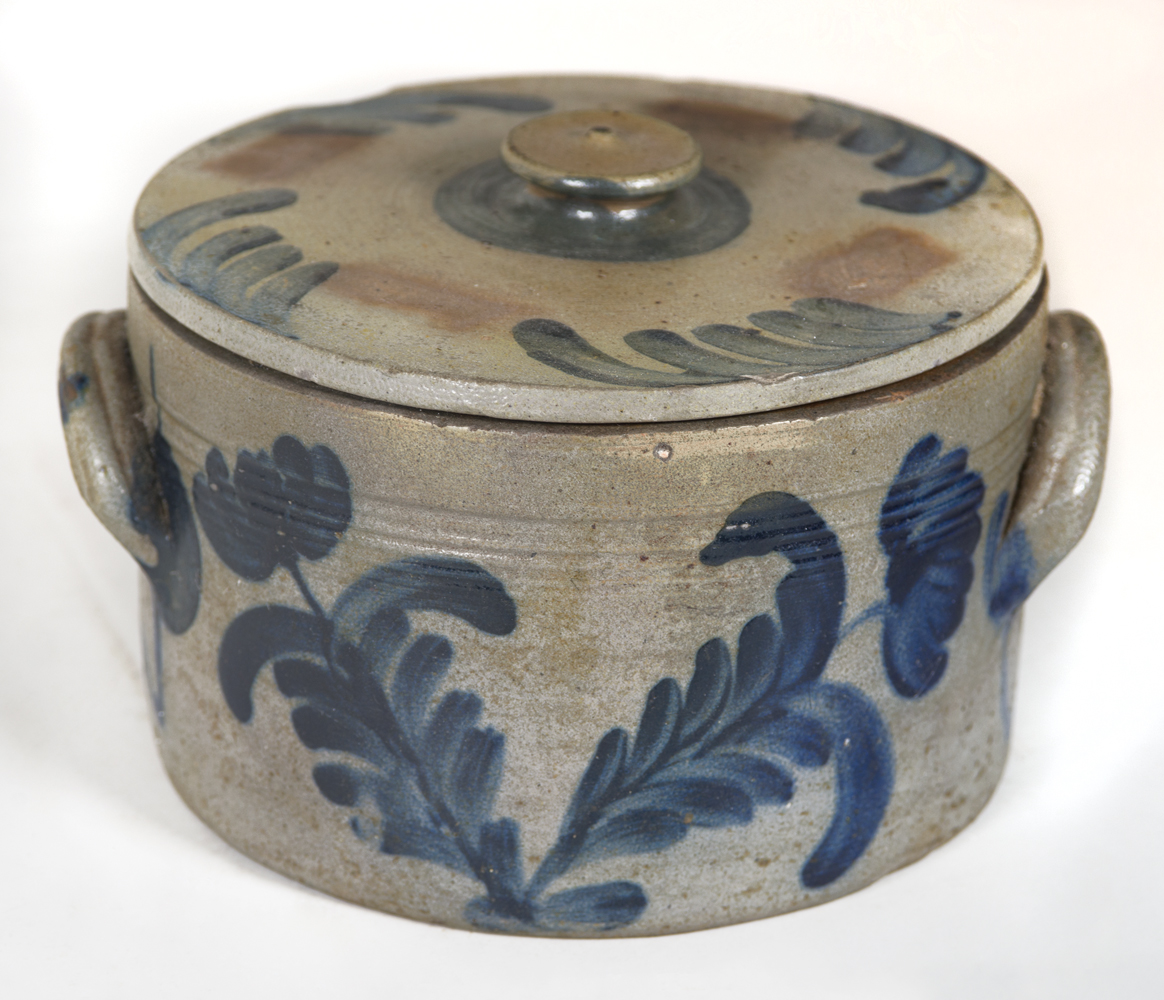 Side handles, decorated with four large, cobalt blue, leafy flowers, blue decorated at the handles, five incised lines, lid decorated with swirls of cobalt blue, lid shows small chips at edge, old chip at rim of crock, from a home in North Marshfield, MA, 6″ h (with lid), 9″ dia.