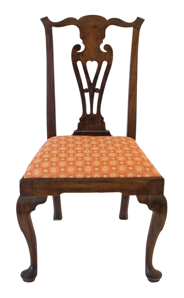 Walnut, old finish, carved crest, cutout back with large heart slip seat, cabriole front legs, pad feet, stamped on back rail “J. Pulling”, c. 1780, some tightening at seat rail in the rear, otherwise good condition, (see American Furniture: The Federal Period, Charles F. Montgomery, 1966), 16 3/4″ seat h, 37 1/2″ overall h, (ex. Dr. Oscar and Lois Hollander collection, Falmouth, MA).