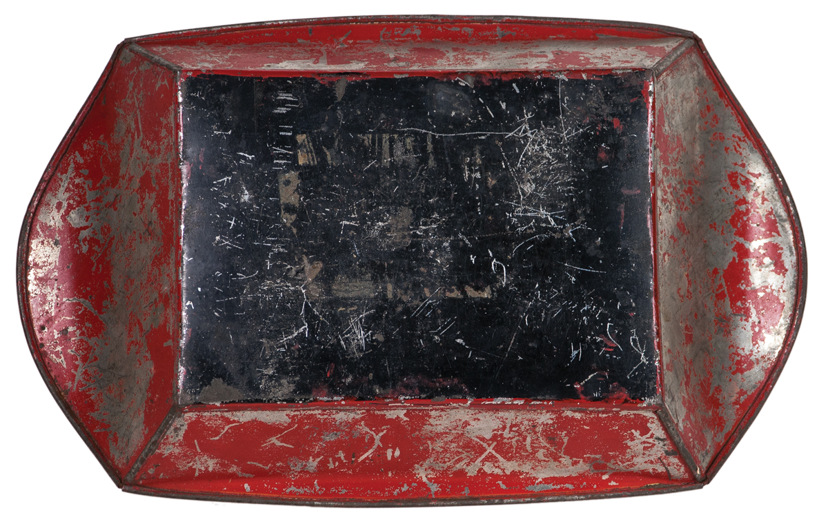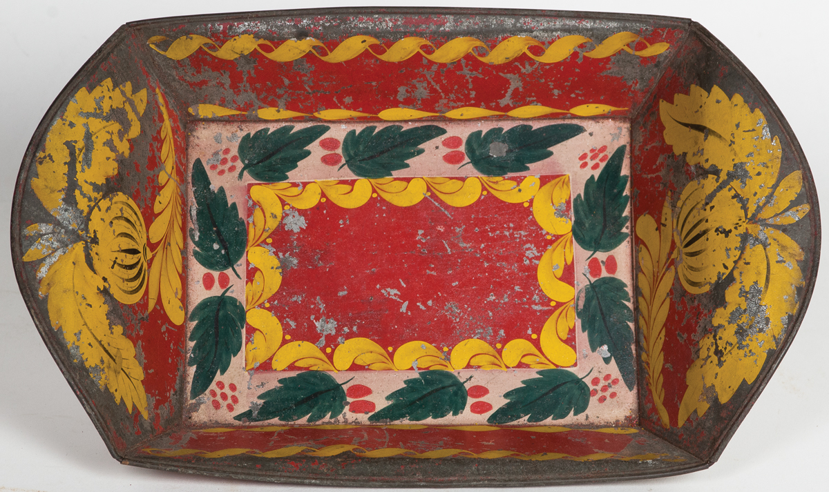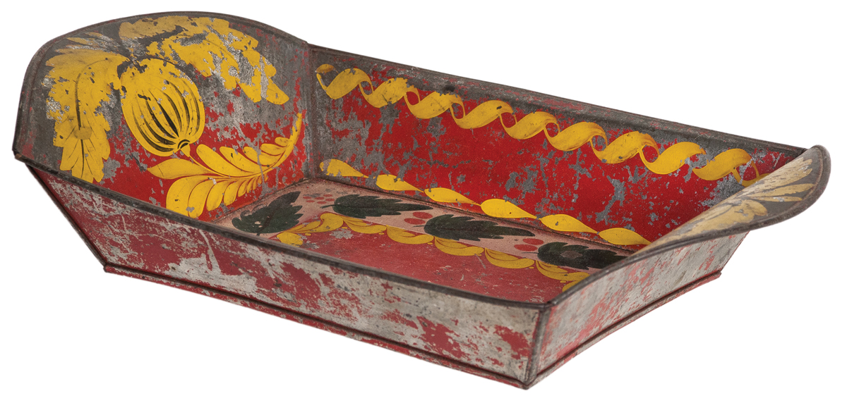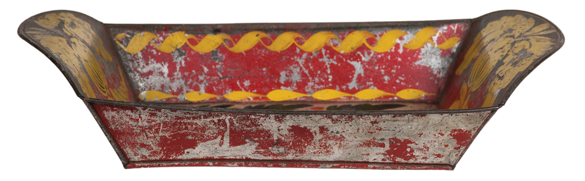 19th c. American painted tinware bread pan, red background (some loss along edges), green leaves on a cream/white band with red berries, yellow brush strokes bordering the red floor, and on the upper sides, (see p. 110, Fig. 3.51 B, Vol. Three American Painted Tinware, Martin and Tucker, for a similar example), 2 1/2″ h (at side), 12 1/2″ l, (ex. Hilgendorf collection, Milton, MA).