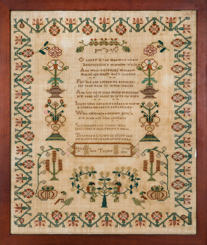 Southern needlework, “aged 11 Jane Taylor year 1831”, (note: born in Columbia County, Georgia according to Ancestral Family Search), very colorful and bold graphic designs of vases and flowers, with an alternating geometric floral and vine border with parrots at the bottom facing each other on a decorative tree.