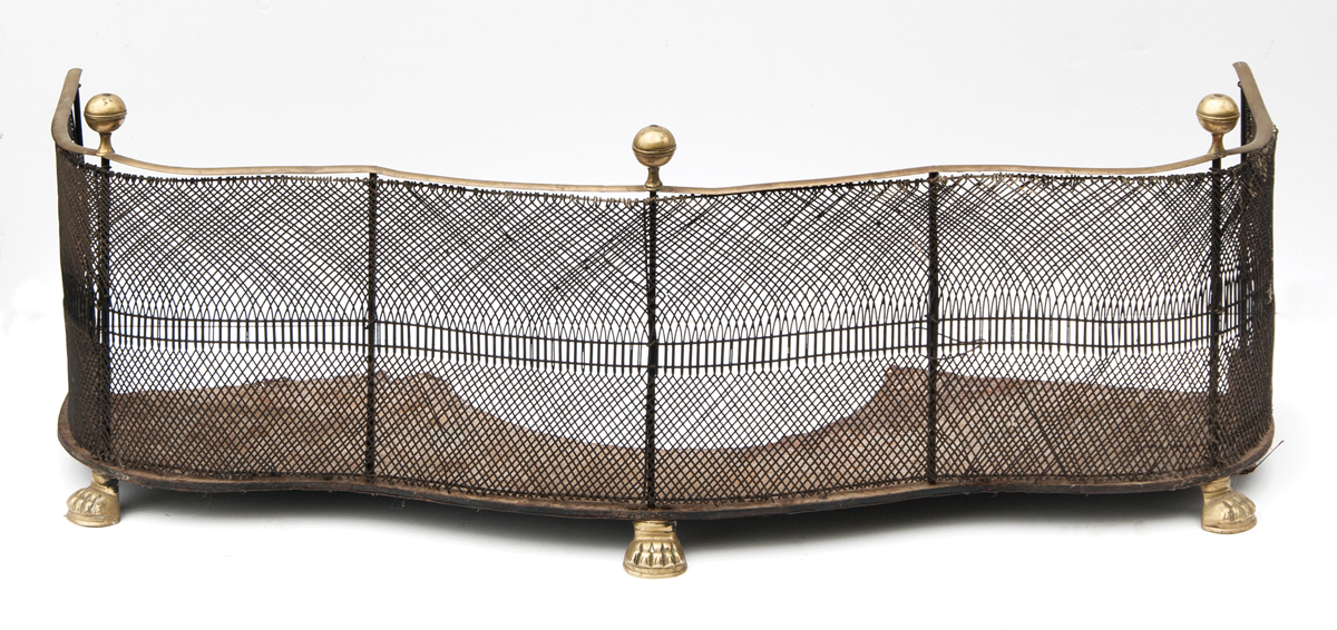Serpentine front, wire and brass, three turned ball finials, and three cast brass paw feet, steel coal catcher, from a North Shore home, overall good condition with minor imperfections, 16 1/2″ h, 36″ l, 16″ d.