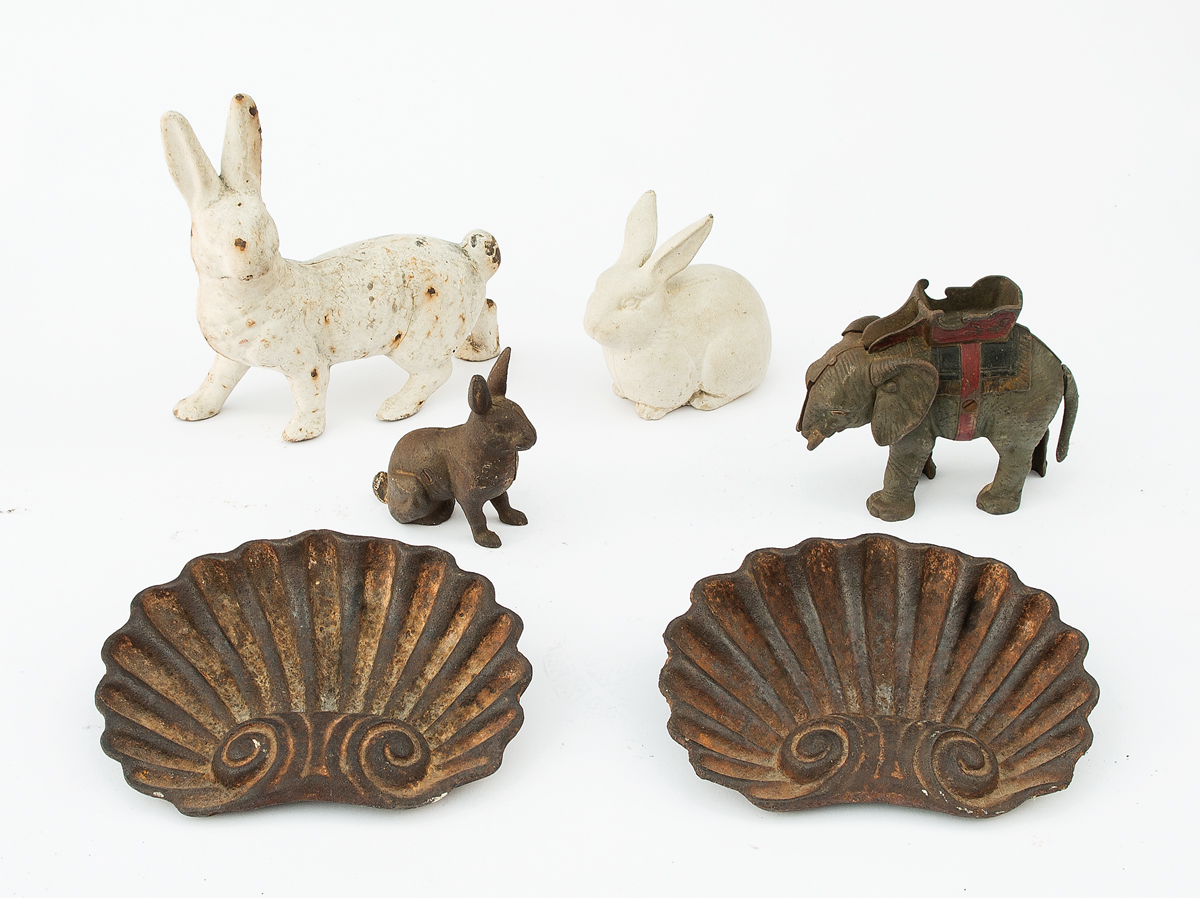Two rabbits with white paint, 9″ h, 8″ l and 5″ h, 6″ l; Elephant still bank, in old green, red and yellow paint, overall good condition, 5 1/2″ h, 7″ l; Small rabbit still bank, 4 1/2″ h, 4″ l; Two cast iron garden shells, 6 1/2″ h, 9″ l; (ex. Ed Clerk collection).