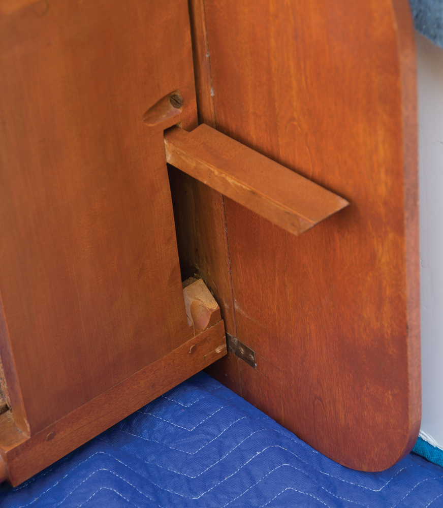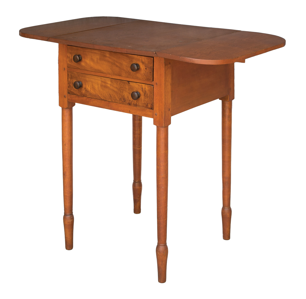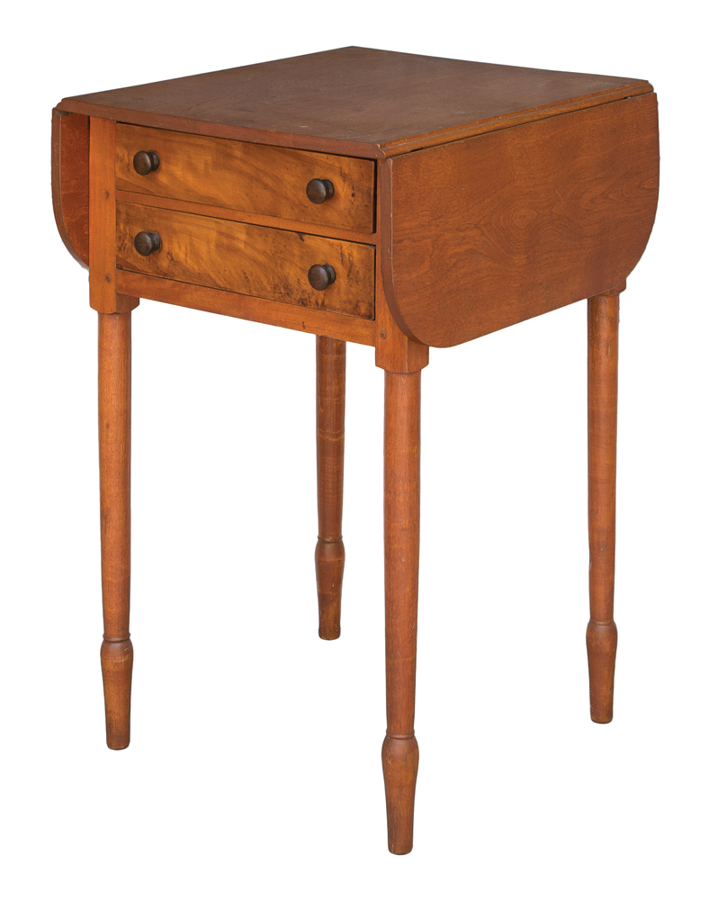 Birch and cherry, walnut pulls, finely dovetailed drawers with figured cherry wood fronts, pegged and mortised construction, elegantly turned legs, with tall accelerated feet, c. 1840, old refinish, excellent condition and proportion, from a Chicago collection, 29″ h, 18″ w, 20″ d, 33 1/4″ w (with leaves up).