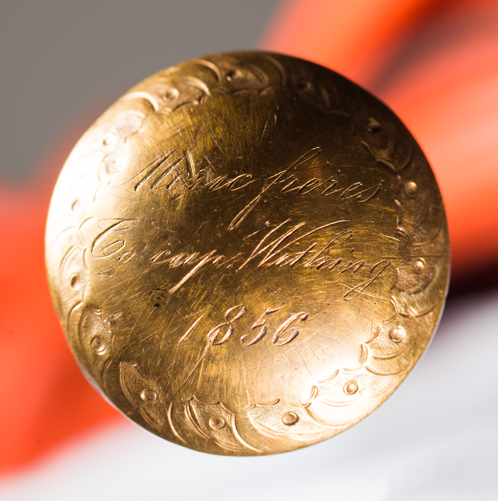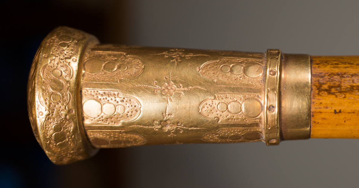 Finely engraved, presentation, gold top cane, inscribed “Meric freres to Capt Whiting 1856″, ivory base partially missing, 31″ l; Turned ivory top cane with rosewood shaft, 35” l; (ex. Whiting estate, Plymouth, MA).