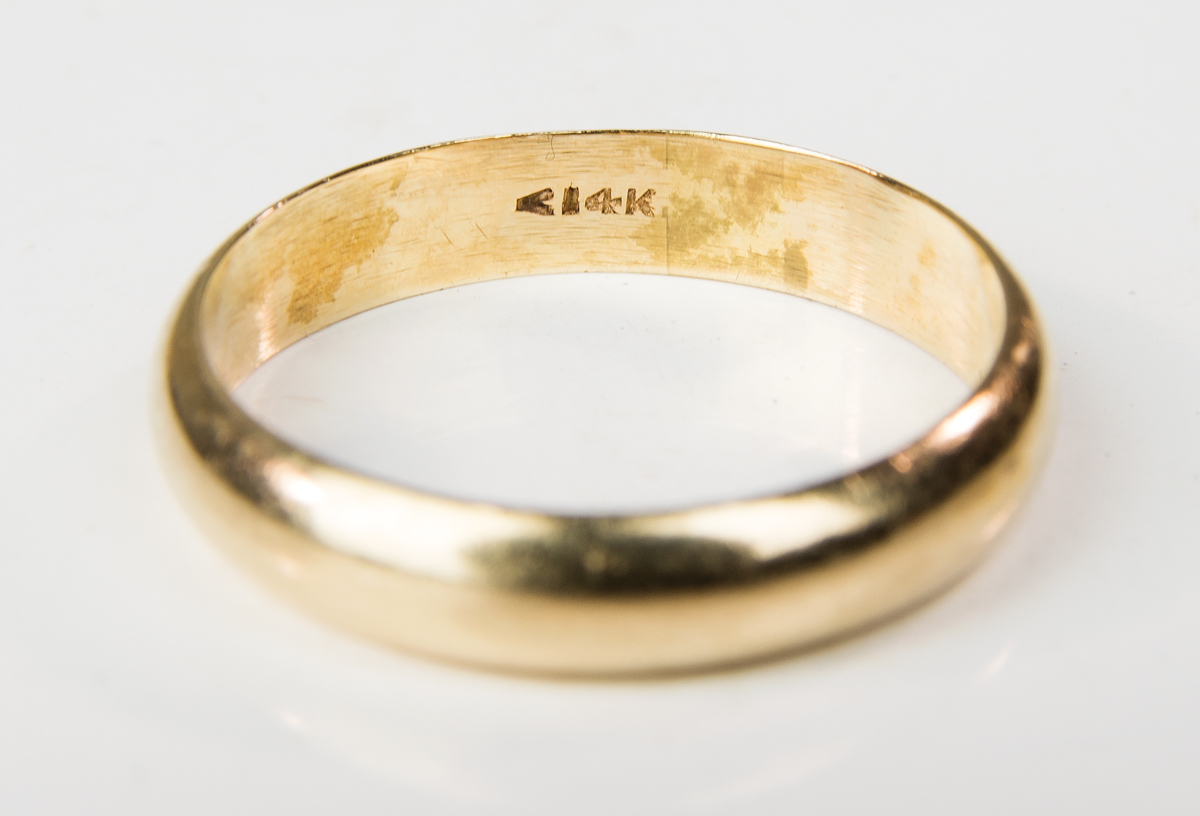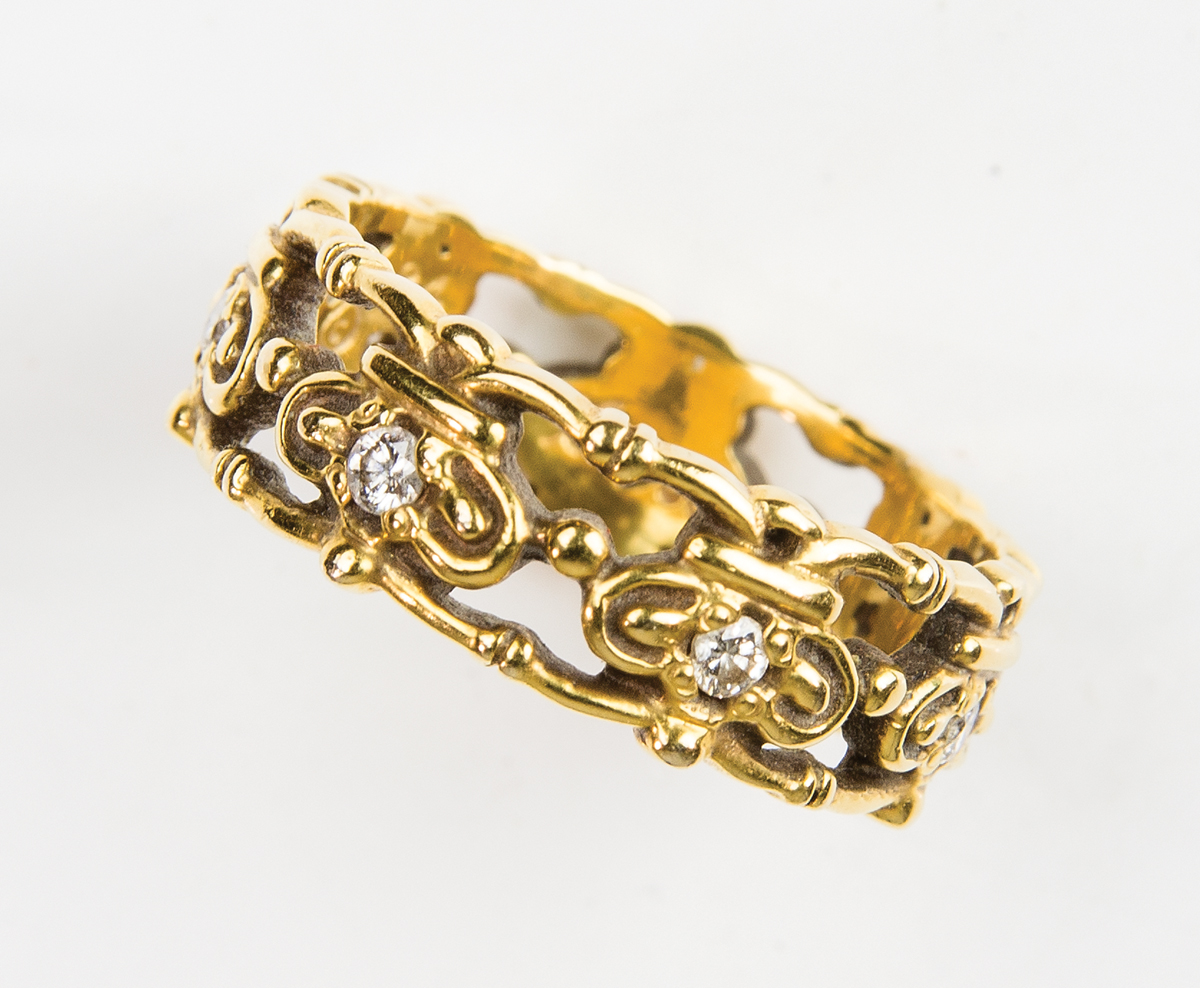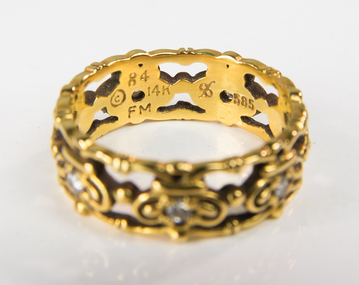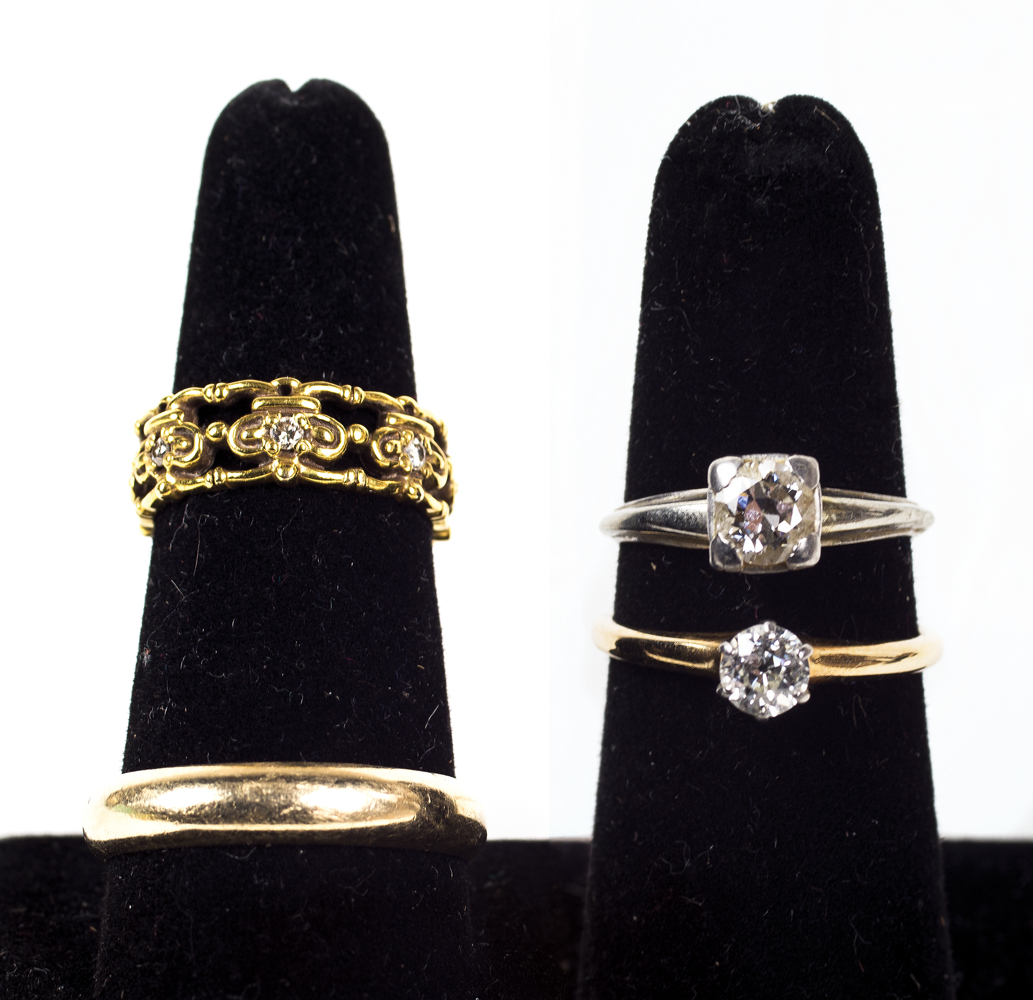 Three gold diamond rings: 14K gold intricately cut band, with six round brilliant cut diamonds, size 7, 5.18g (overall wt); 18K white gold band (cut), set with a round brilliant cut diamond, (5.27mm-.54ct); gold ring with round brilliant cut diamond, (3.3mm); 14K gold man’s wedding ring, (5.39g); 14K gold Italian necklace, with a round brilliant cut diamond set in gold, (4.78mm); (ex. Anna C. Roeder estate, Quincy, MA).