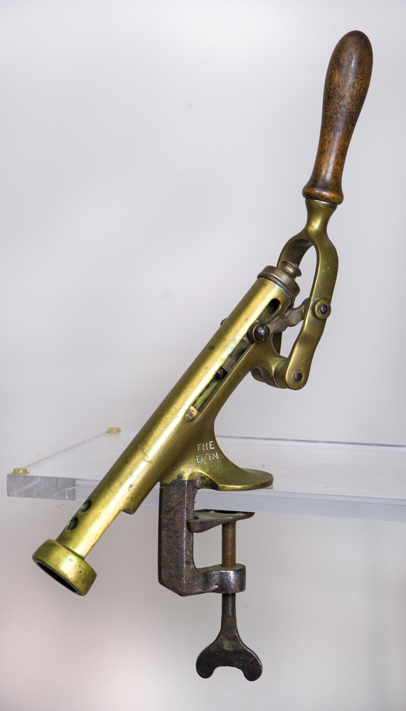 Early 20th c. brass and iron bar mount corkscrew, turned hardwood handle, cast iron thumbscrew, “The Don”, (patented 1903), 12″ h, 5″ handle.
