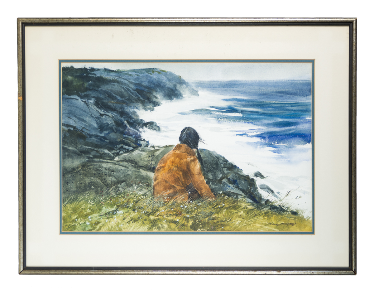 Rocky coast with figure in a brown coat looking out to sea, (probably Monhegan Island, Maine), signed l.l. “Dan Stone” (NA, 1929-2015), American Watercolor Society, American Society of Marine Artists, Salmagundi Club, N.E. Watercolor Society, framed and matted, 14 1/2″ x 21″ (sight), 22″ x 29″ (frame), (ex. Channing Howe estate, Duxbury, MA).