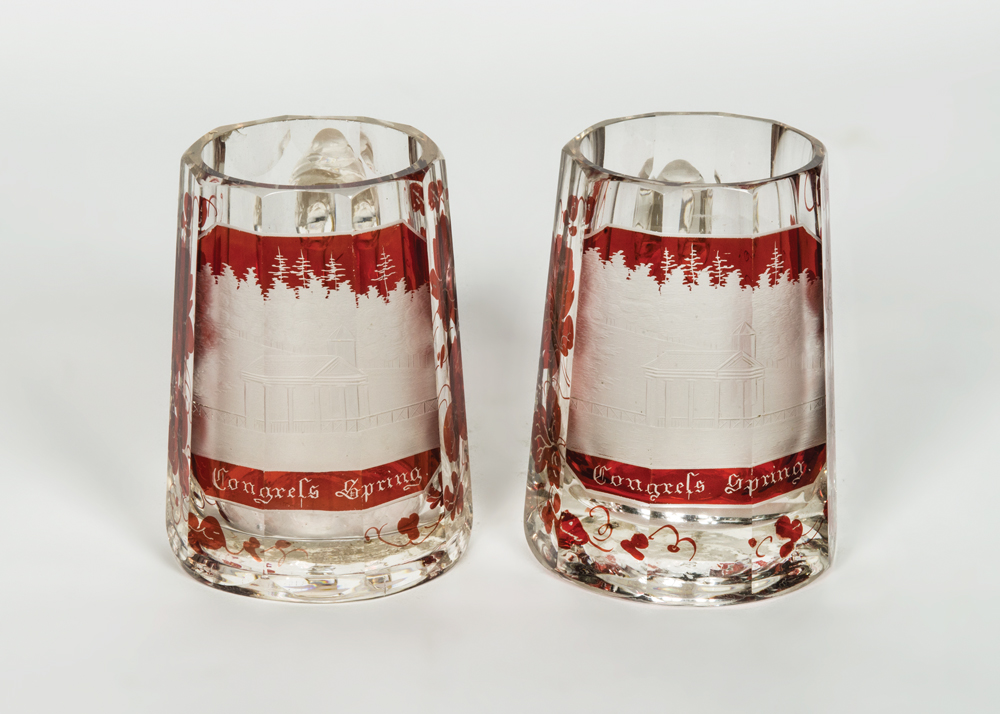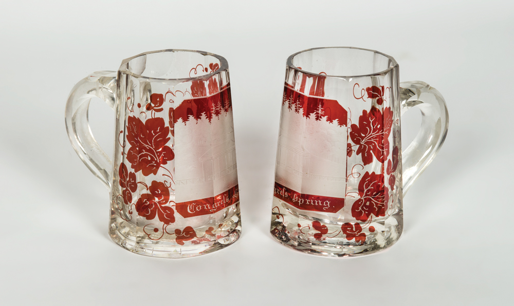 Rare Bohemian glass paneled mugs, with an etched and frosted American scene decoration of the original “Pavilion at the Congress Spring”, in Saratoga Springs, NY, a red leaf and tendril surround, 4 1/4″ h.