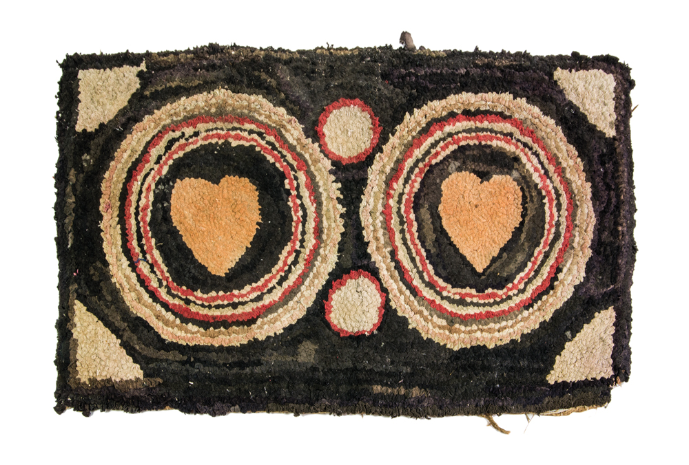 Hooked rug with two hearts in circles, black background with four triangular beige decorations, some damage on one corner, 23″ x 39″.