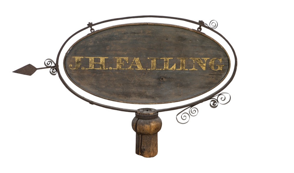 Pine with gilt lettering on both sides, “J. H. Failing”, cast and forged iron strapping, and curlicues with arrow point on remnants of original post, with history, 34 1/2″ overall h (with post), 53 1/2″ overall w.