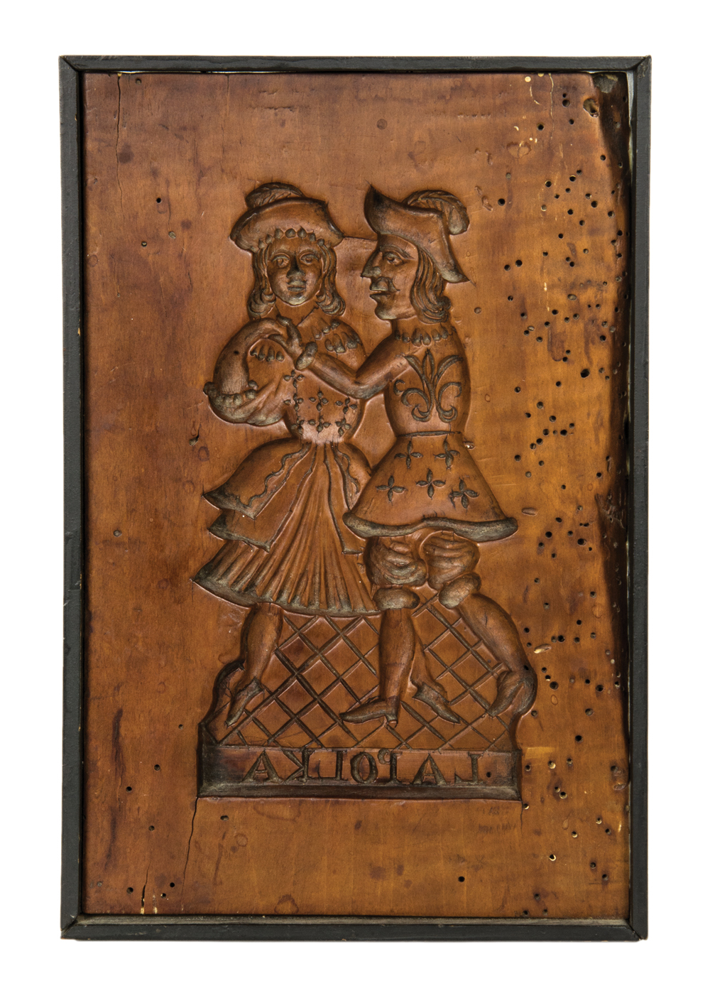 Carved fruitwood cookie mold, “La Polka”, framed in black, depicting a gentleman and lady dancing the polka, good patina, found in the Mohawk Valley of New York, 8 3/4″ h, 5 1/2″ w.