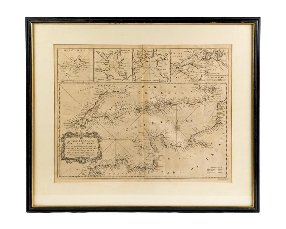 “A Correct Chart of the English Channel,…from Calais to Brest on the Coast of France”, “For Mr. Tindal’s Continuation of Mr. Rapin’s History”, London, 1746, (framed at “Goodspeed’s Book Shop, Boston.”), 15 3/4″ x 19 1/2″ (sight).
