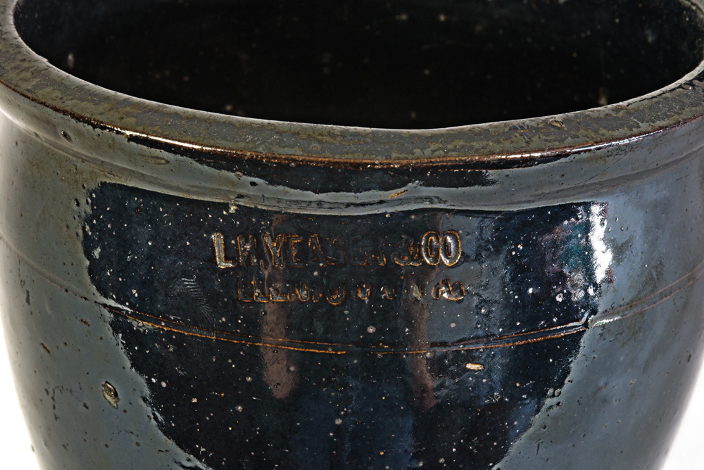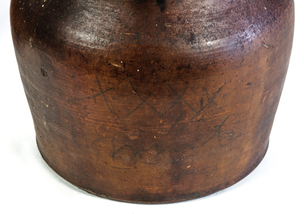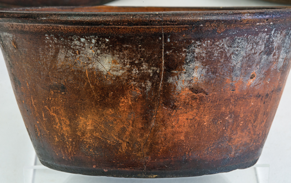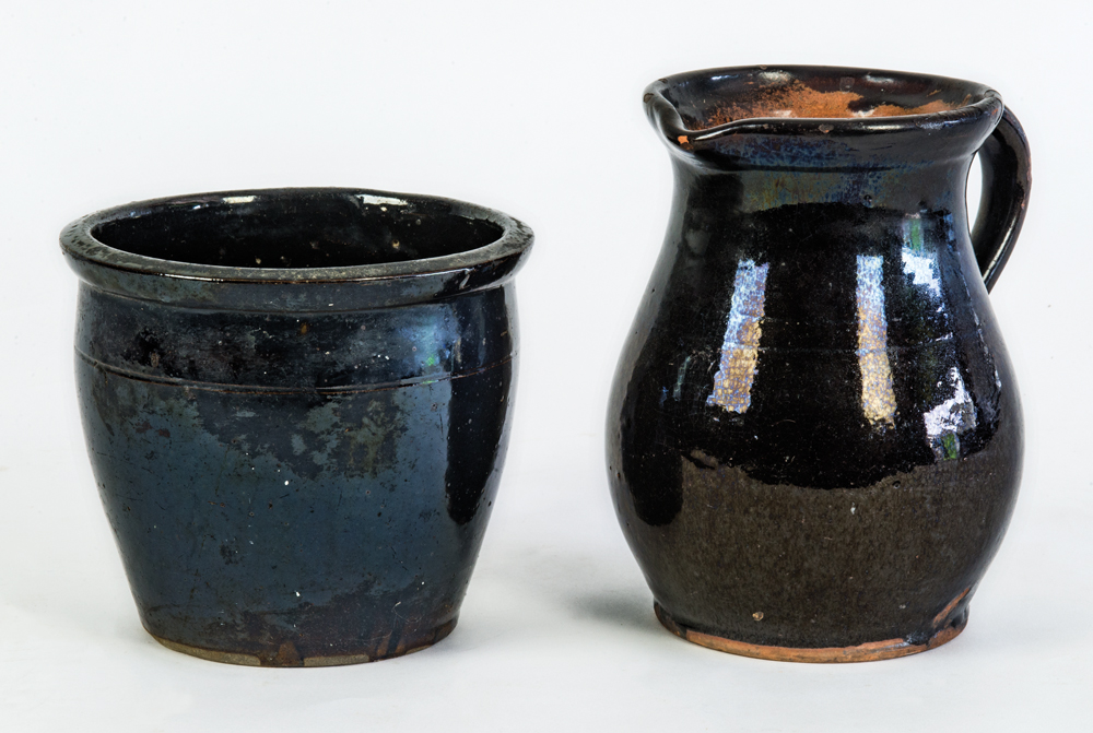 Collection of eight redware pieces: crocks, bowls with red glaze, bean pots, and a pitcher, 8″ h; overall good condition, minor chips on bottom.