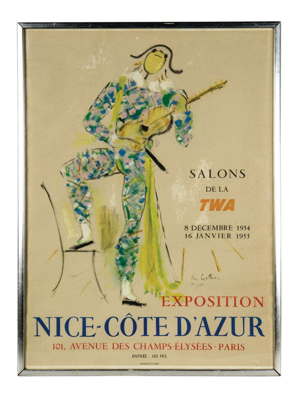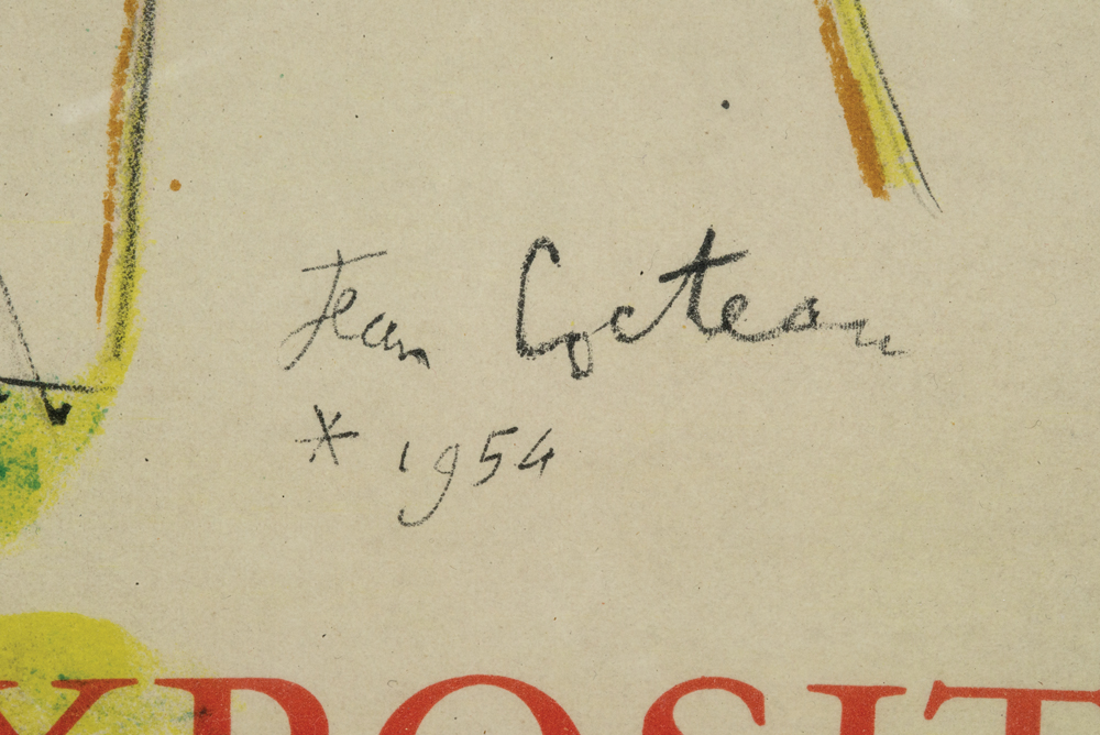 Framed poster, “Exposition Nice-Cote D’Azur”, 101 Avenue Des Champs-Elysies, Paris”, Salons de TWA 4 December 1954, 16 January 1955, Jean Cocteau artist (signed in the plate), 1954, minor creasing and toned, 26 1/2″ h, 19 1/2″ w.