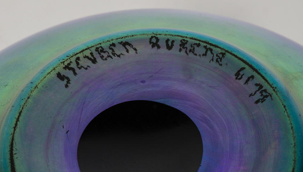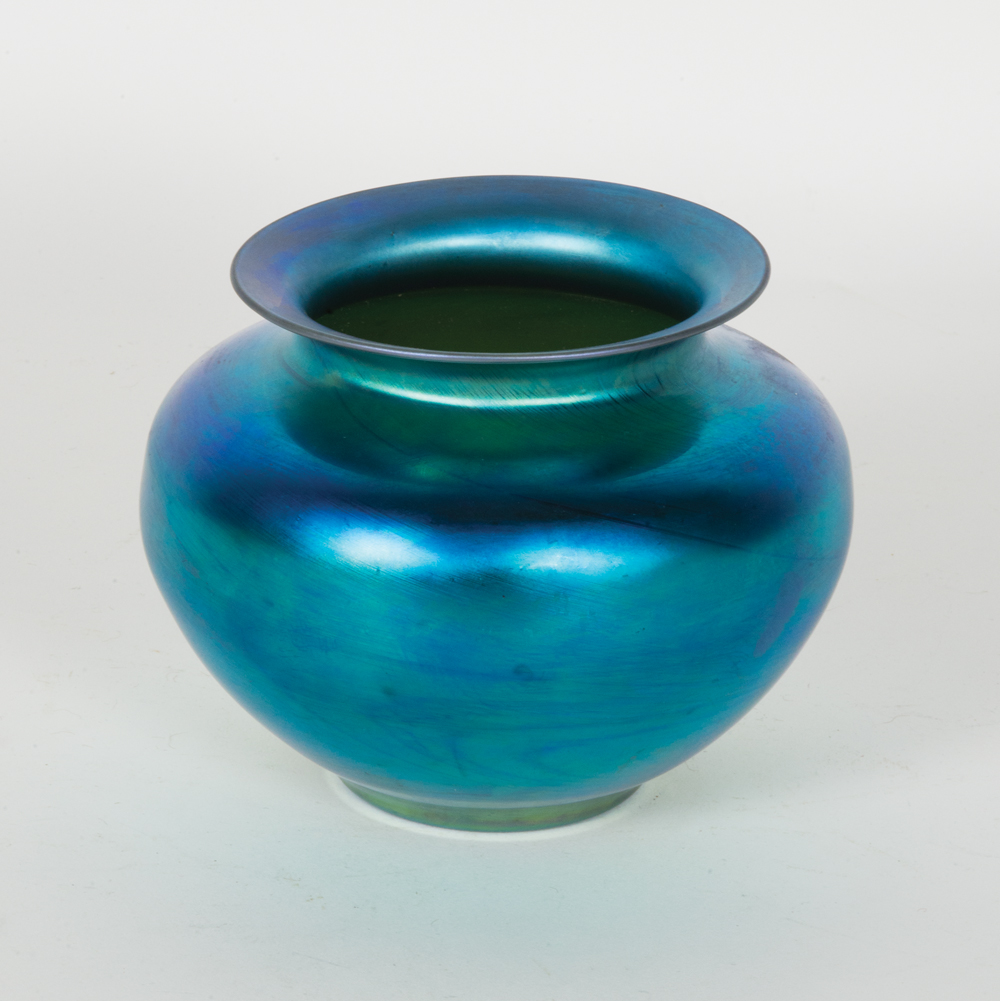 “Steuben Aurene”, iridescent blue vase, polished pontil, “-178″, 5″ h, 6 1/2” dia.