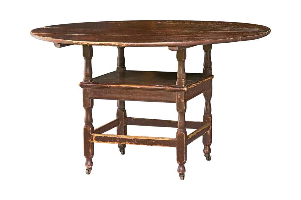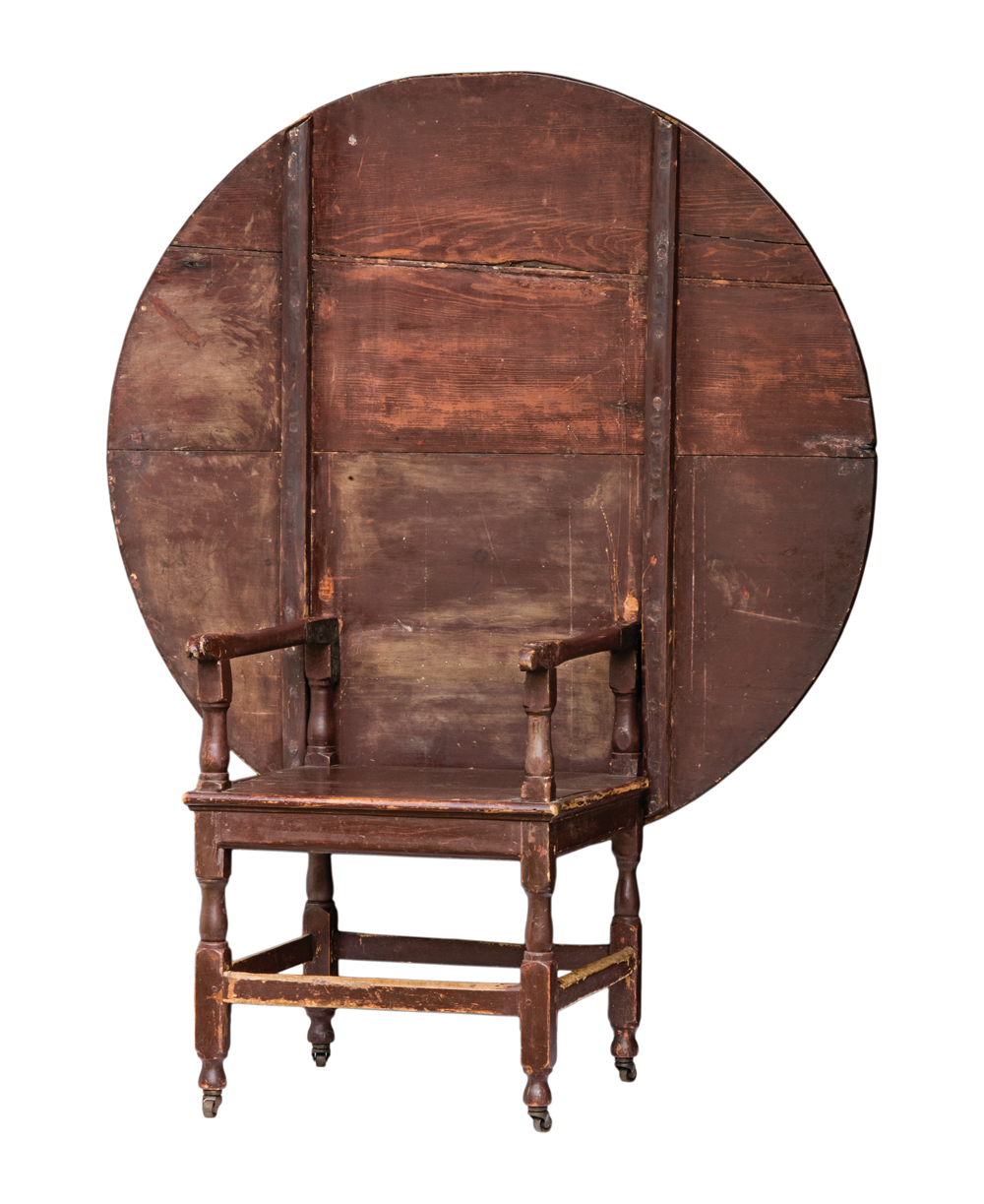 Pine and maple, early brown/red painted finish, turned arm supports, worn “H” stretcher, round top, on castors, (collector found in upstate New York in the 1970’s), 27 1/2″ h, 45 1/2″ dia.