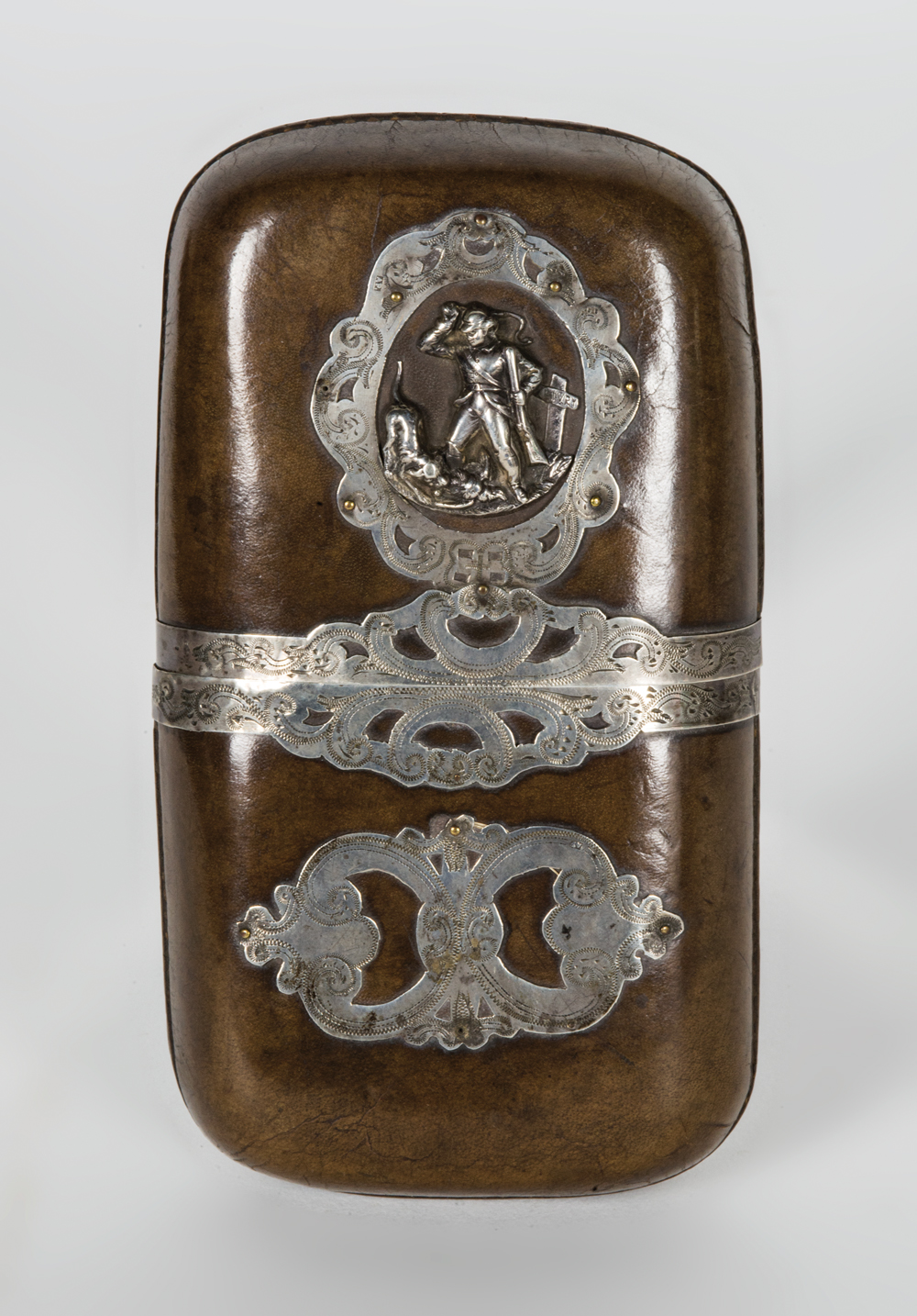 Leather trimmed with silver, hunter and a dog with bird in mouth, and tombstone cross “LIVRY.”, 6″ x 3″.