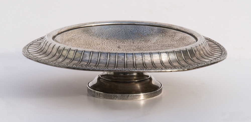 Footed, hand-hammered bowl, with fluted rim and floral edge, “W” (with arrow), “Sterling, Cement Loaded”, 10 oz t Total Wt.