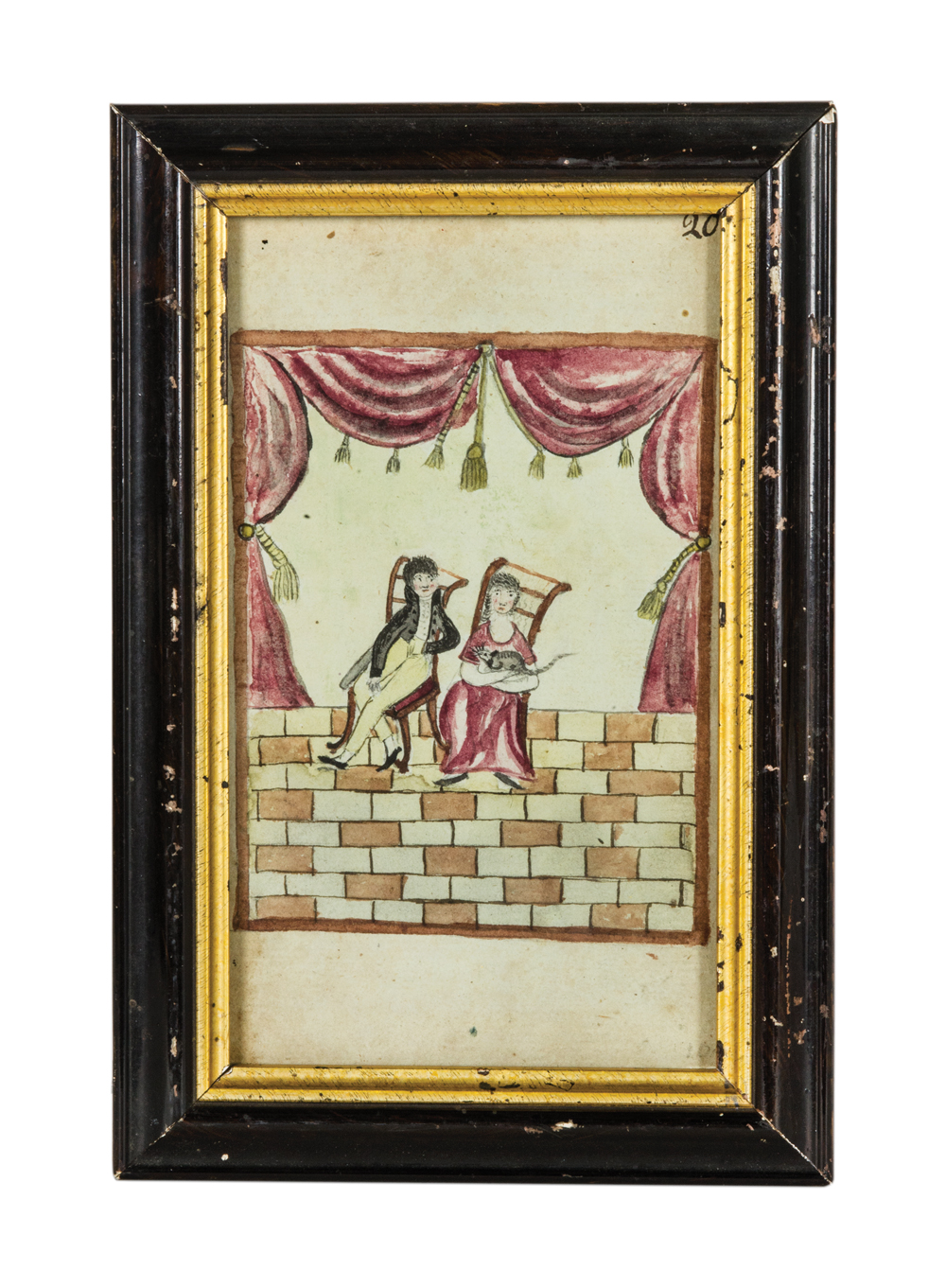 Seated man and wife holding a cat, swag and tassel curtain backdrop, red and white brick floor, marked “20” in upper right corner, in a period black and gilt frame, 6″ x 3 1/4″ (sight).