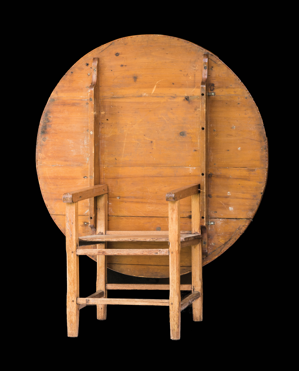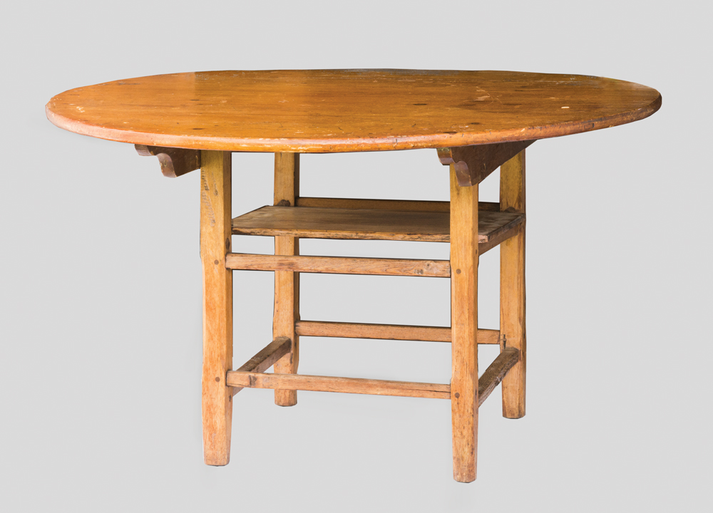 Pine round top, old refinish, maple base, box stretcher, wood pegged into legs, 25 1/2″ h, 42 1/2″ dia top.