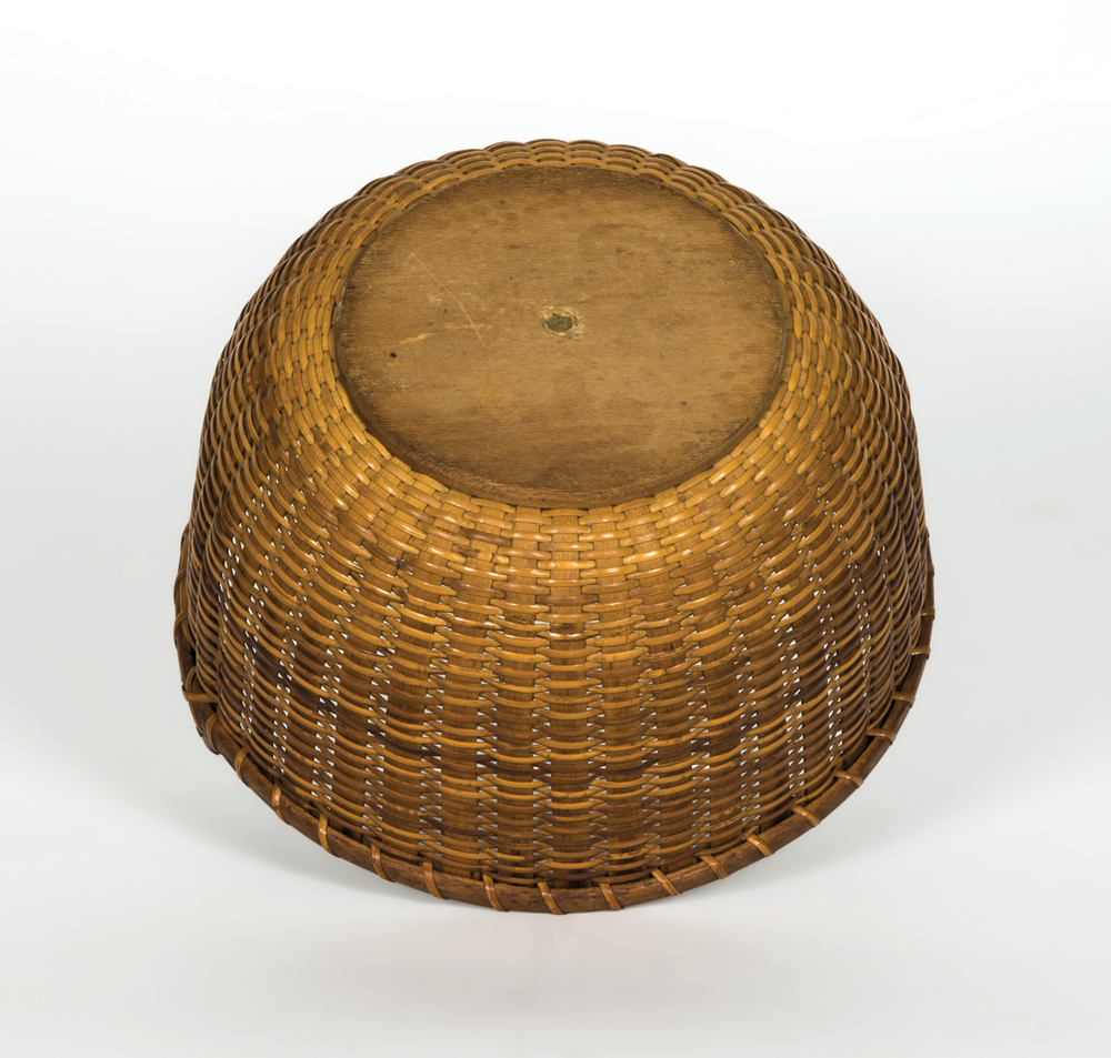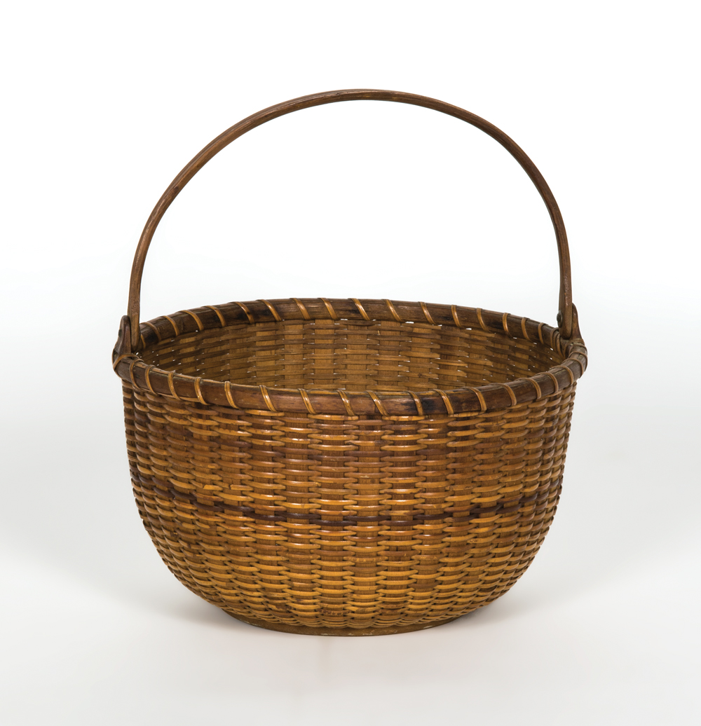 Carved wood ears, finely carved swing handle, secured with copper pins, excellent condition and patina, 5″ h (to rim), 9 3/4″ h (to top of handle), 8″ dia.