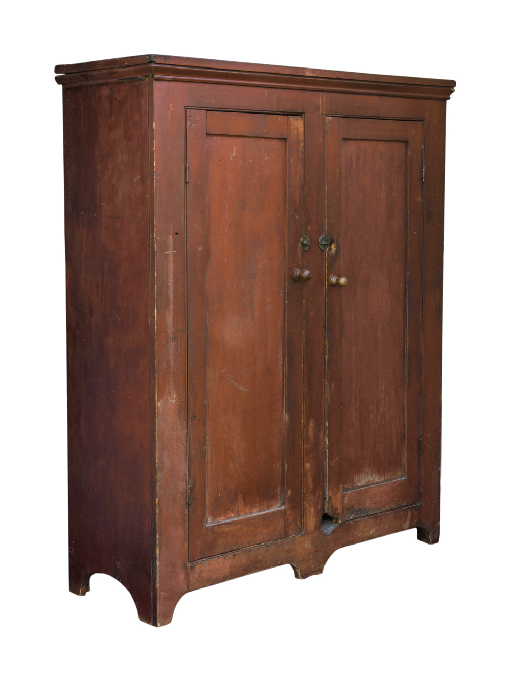 New England, pine, two pegged doors, in original red/orange painted finish, molded top, four shelf interior, brass door closures and wood pulls, large mouse hole in bottom of right door, 64″ h, 54″ w, 18″ d.