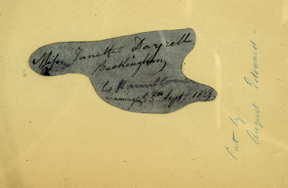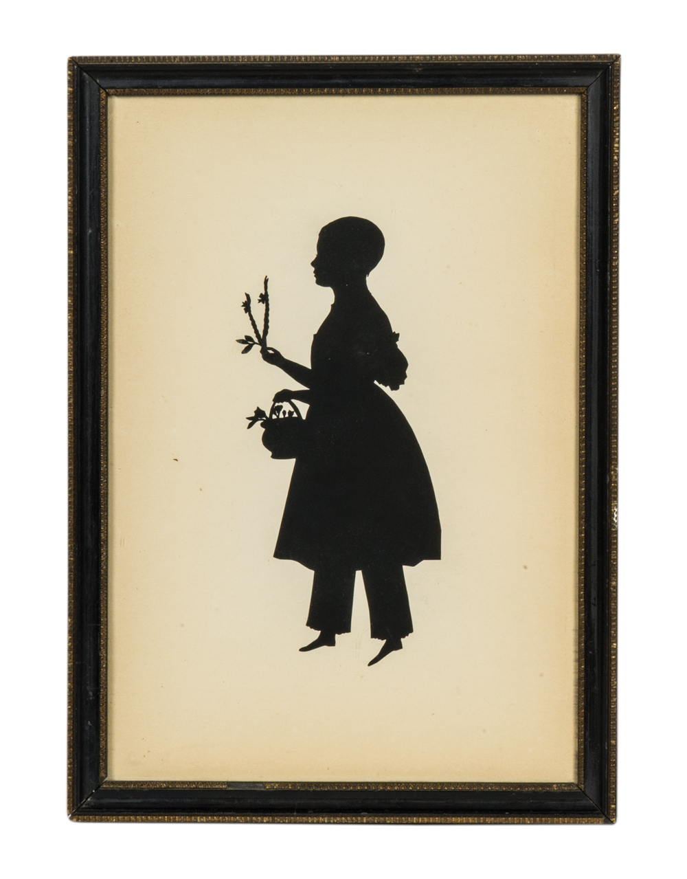 Silhouette of a young girl gathering flowers into a basket, signed on back “Miss Janette Daryrell, Buckingham, 5th Sept 1838”, “Cut by August Edoward”, framed.