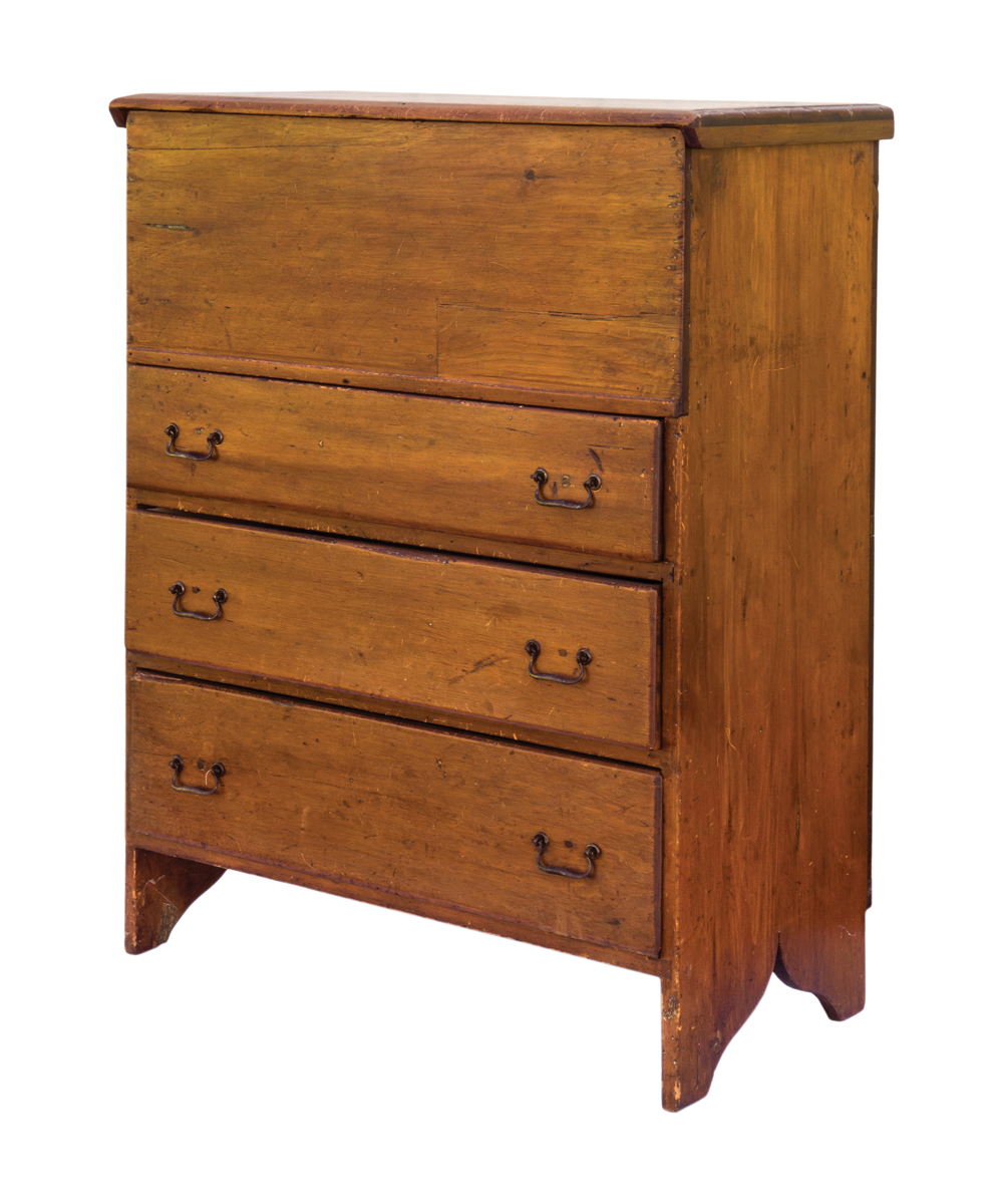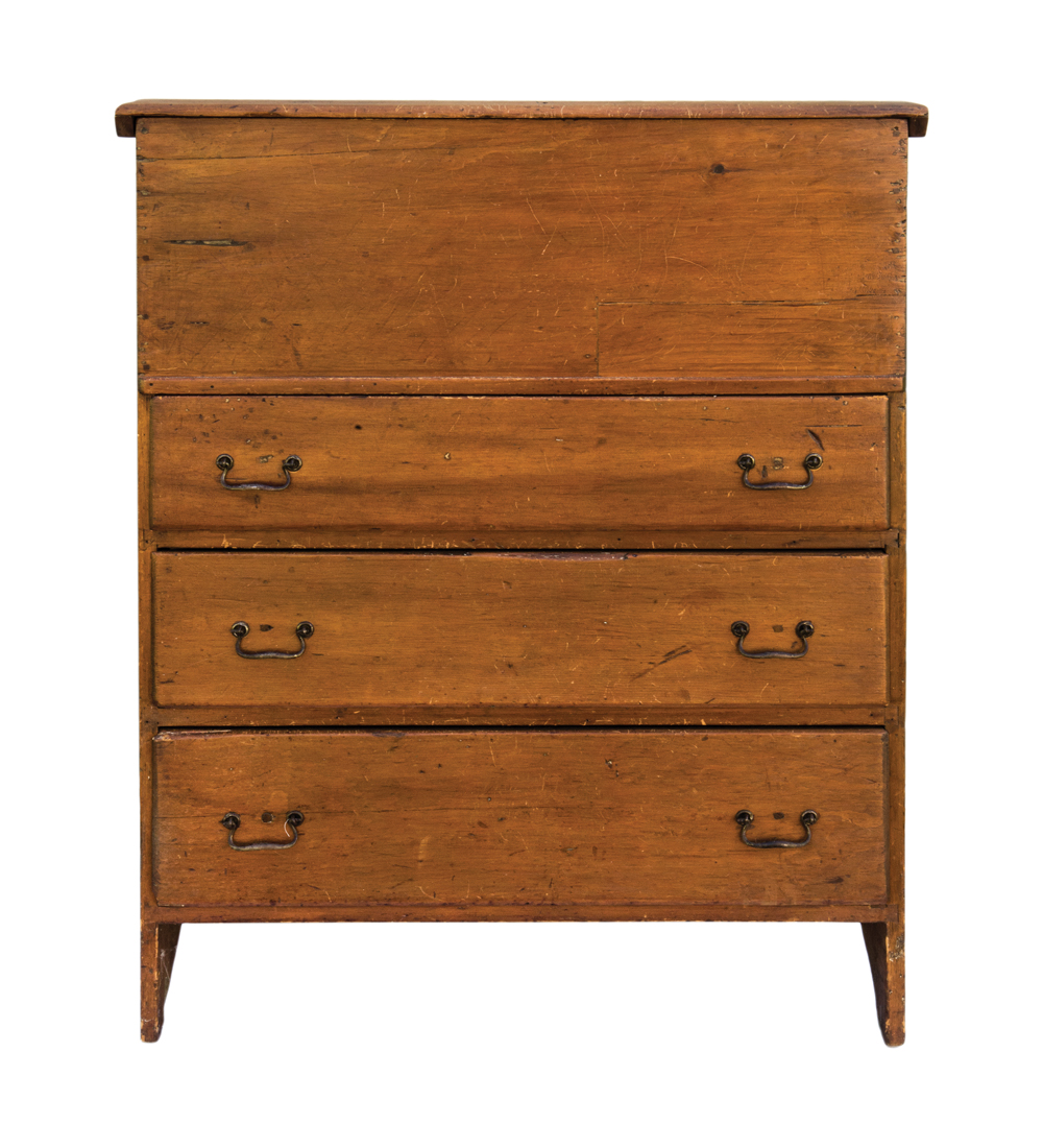 New England, pine, three-drawer blanket chest, bootjack ends, old refinish, old repairs to the front, two board back, 48″ h, 36″ w, 18″ d.