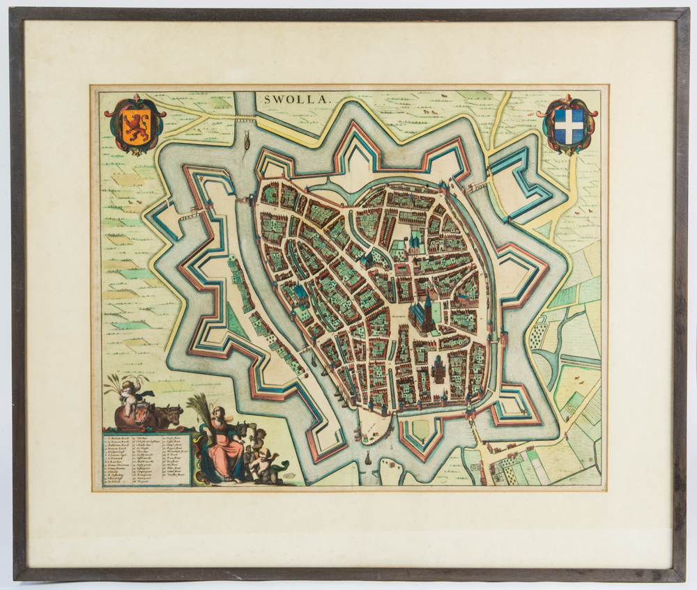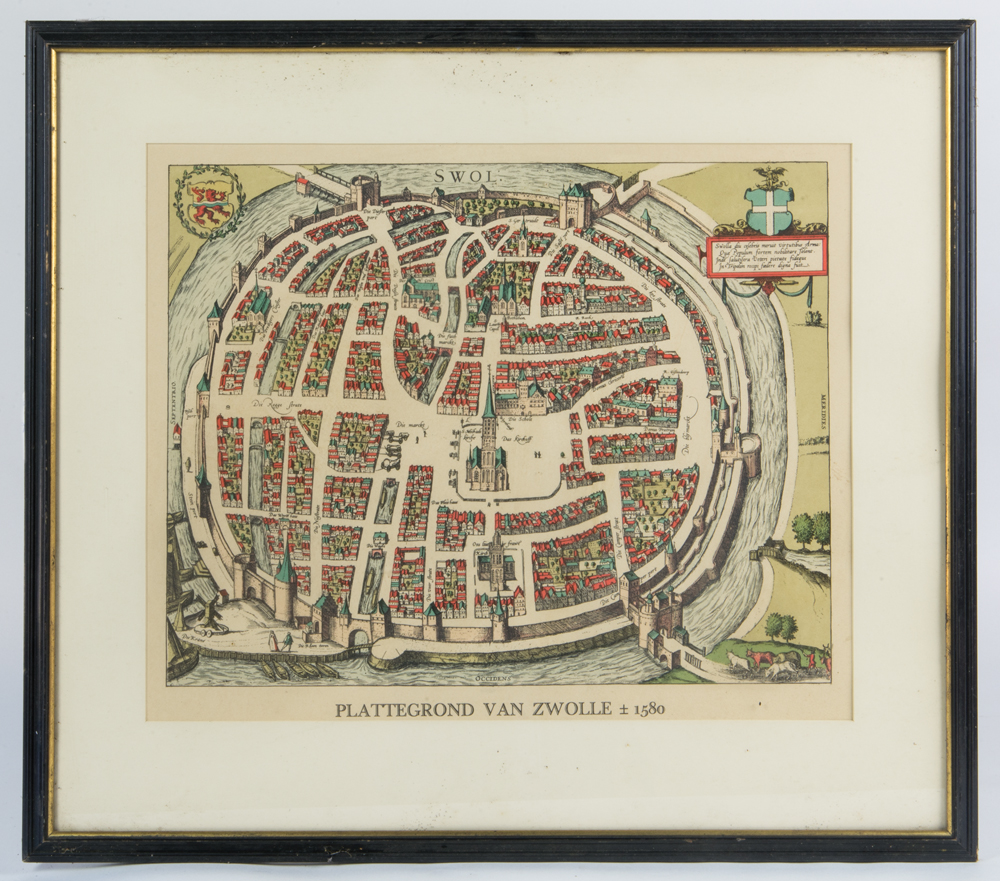 Hand-colored “Plattegrond Van Zwolle 1580″, 14″ x 17 1/2″ (sight); Swolla”, showing houses from a bird’s-eye view, Netherlands, 1600’s, 16″ x 20 3/4″ (sight); both framed at “Goodspeed’s Book Shop in 1958”.