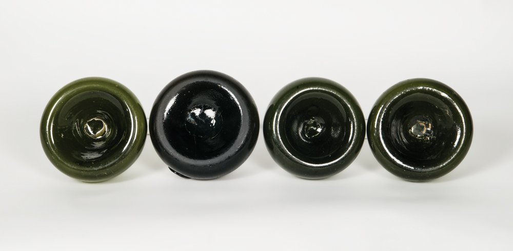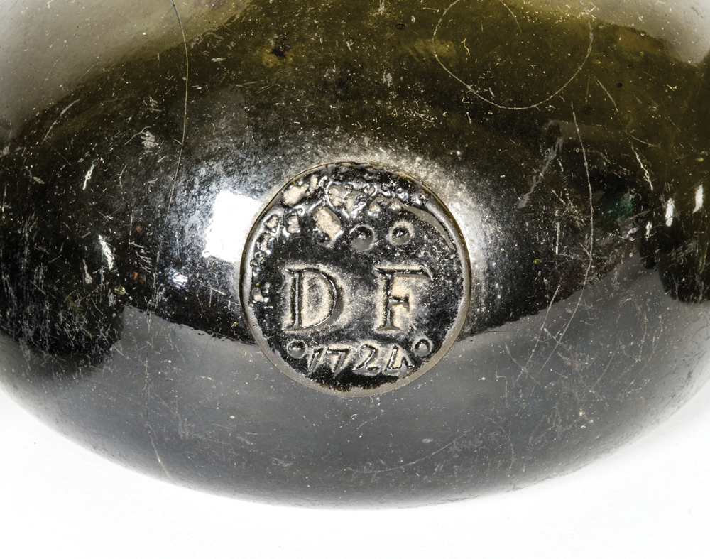Dark olive green glass blown bottles, all with open pontils, one sealed and dated “1724” “DF”, (shows a crack), 6 1/2″ h; others are 7 1/2″ and 8″ h.